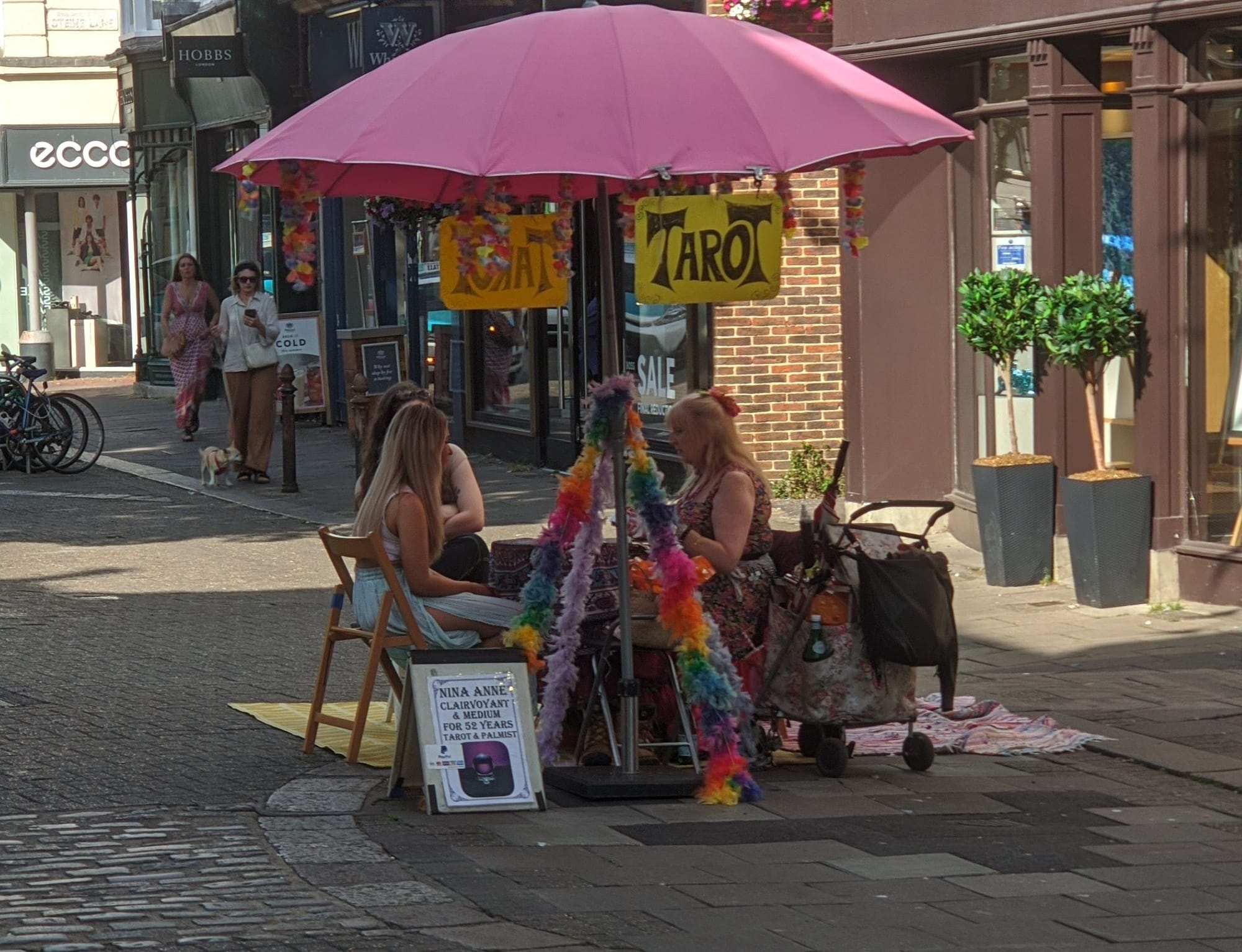 Und wundere mich, dass mitten in der Fußgängerzone eine Wahrsagerin ihren Teppich ausbreitet.
