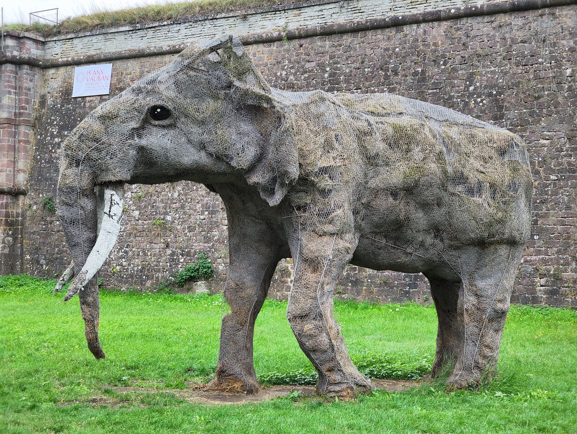 Wir kommen an Neuf-Brisach, einer Stadt, die Anfang des 18. Jahrhunderts in Form eines Achtecks erbaut wurde, vorbei. Vorbei und nicht durch, da mein Navi mich verwirrt. Wir fahren außen an der Befestigung, durch den Graben, um die Stadt herum. Dort treffen wir auf einen Wach-Elefanten.