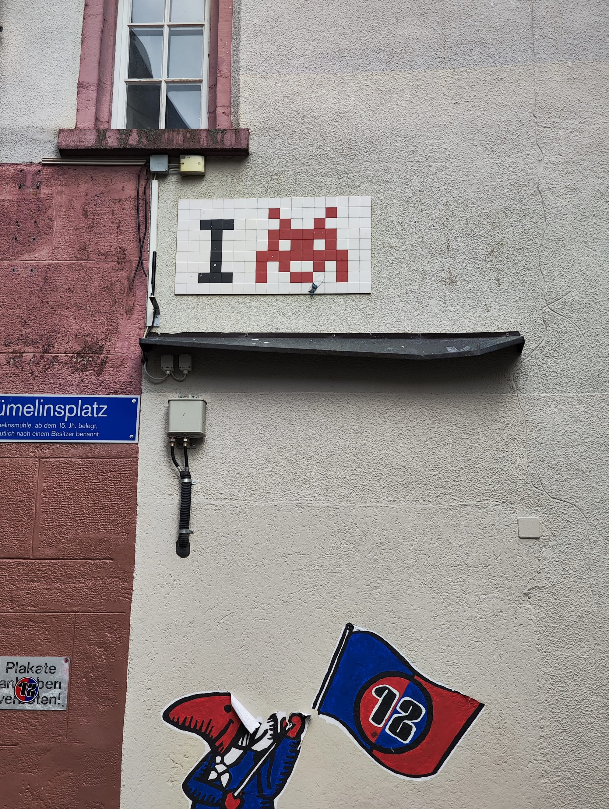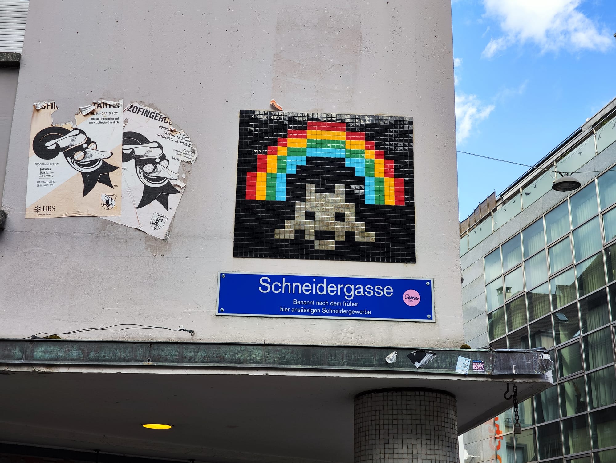 Und auch in Basel finden sich die Mosaikbilder aler Invader Streetart. Hatte ich die Bilder letztes Jahr zuerst in Paris gesehen, scheint sich das Phänomen weiter auszubreiten.