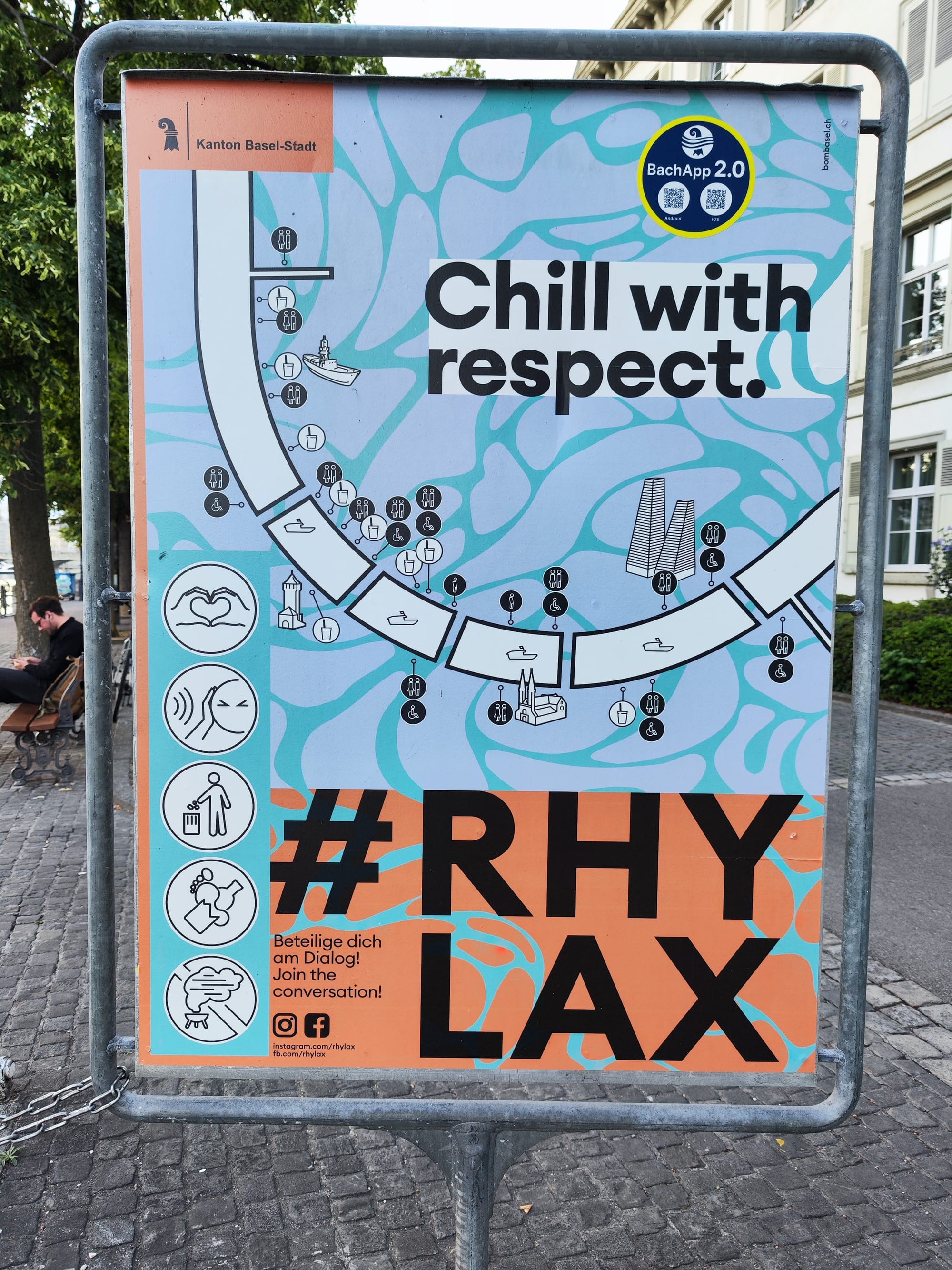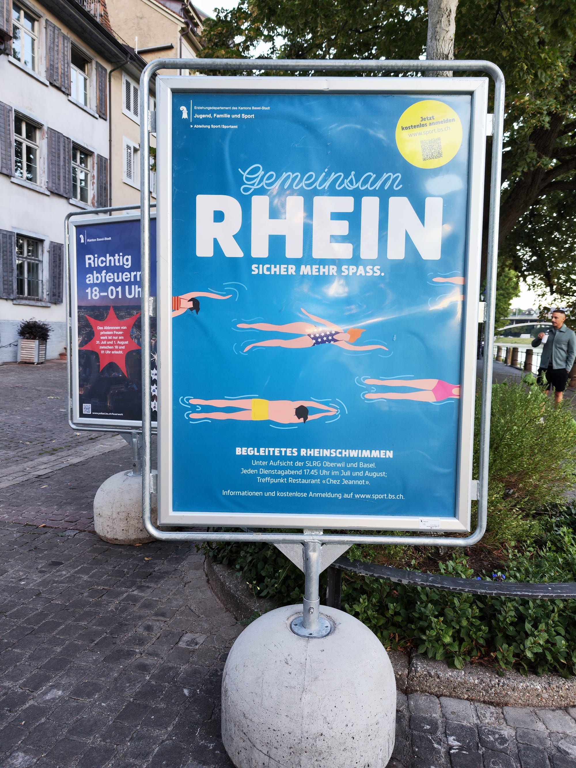 Der Rhein sieht schön aus und hier und da treibt, trotz der fortgeschrittenen Uhrzeit von ungefähr 18 Uhr, der ein oder andere den Rhein entlang. Fast an jeder Stelle des Ufers kann man den Rhein erreichen. Unzählige Menschen sitzen an den Uferbefestigungen, unterhalten sich, trinken etwas, lesen ein Buch oder lassen ihre Füße einfach nur ins Wasser hängen. Das Ganze wirkt irgendwie entschleunigend auf mich. Auch wenn mich Basel, so auf die kürze, selber noch nicht überzeugen konnte, dass ist schön.