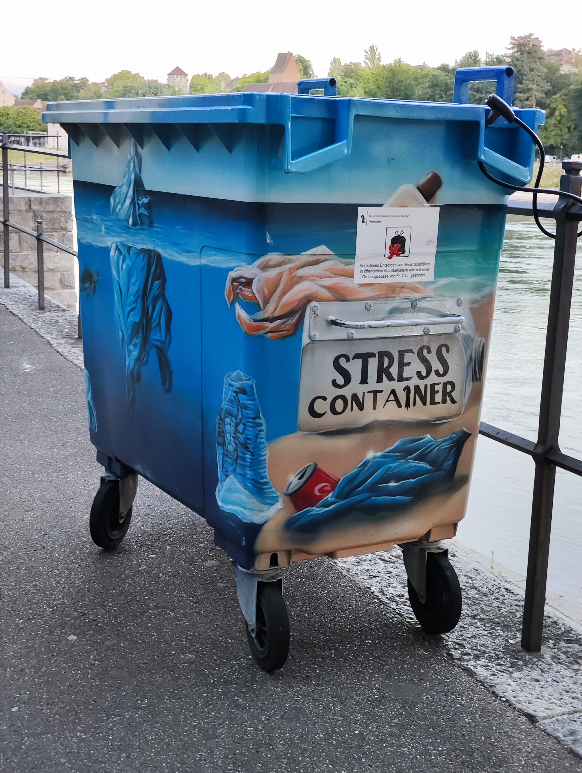 Hier und da stehen bunt angemalte "Stress" Müllcontainer auf der Uferpromenade, ich vermute mal ein Überbleibsel der Bundesfeier.