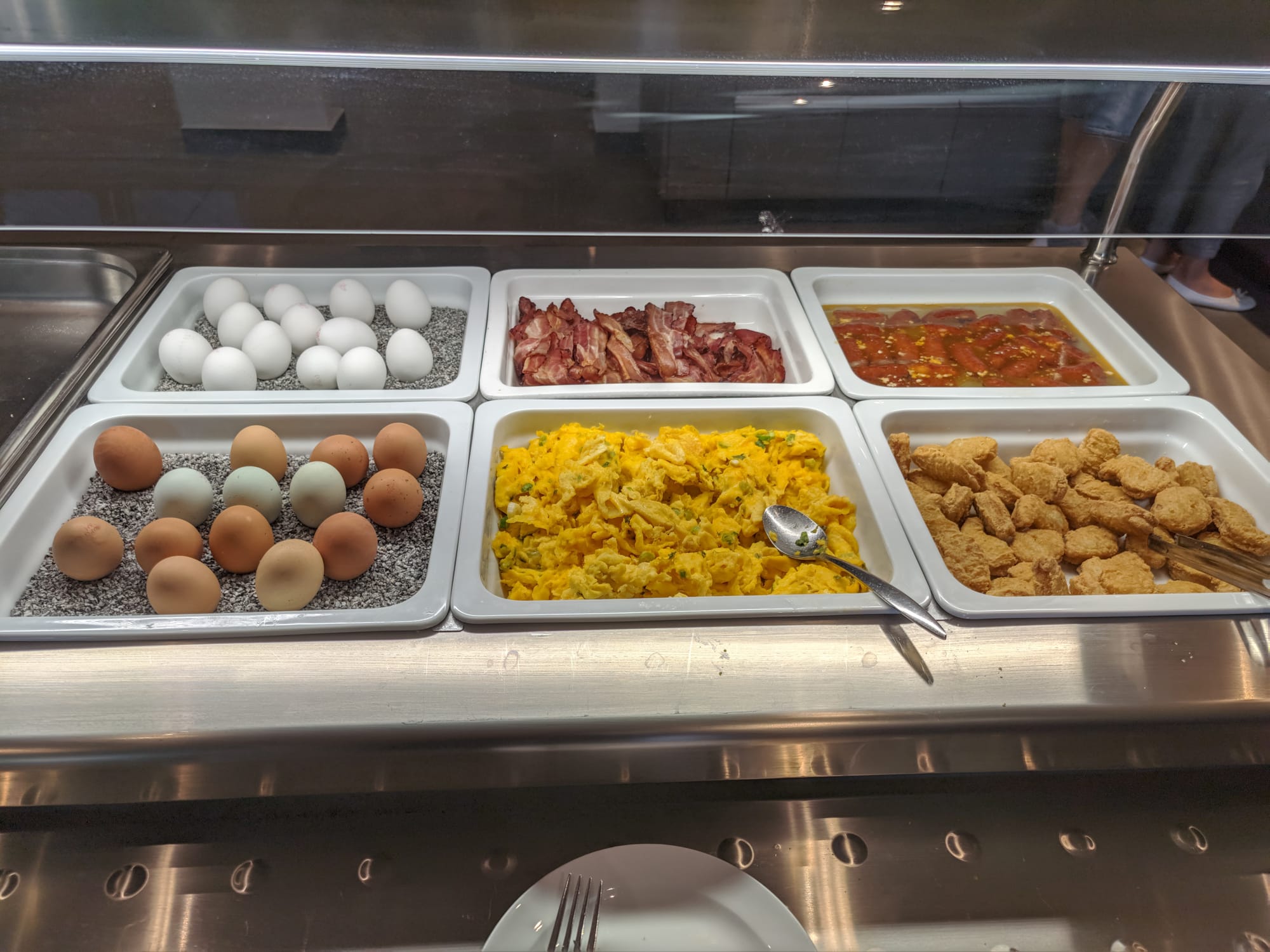 Es gibt Eier gerührt, hart und weich. Frühstücksspeck und kleine Würstchen. Und das Buffet bietet doch tatsächlich auch noch Chicken Nuggets. Ehrlich gesagt überrascht mich die Auswahl ein wenig, bei einem Hotel, das im Namen Vital stehen hat habe ich ehe Bircher Müsli und andere natriumarme Lebensmittel erwartet. Aber ich beschwere mich nicht. 😋