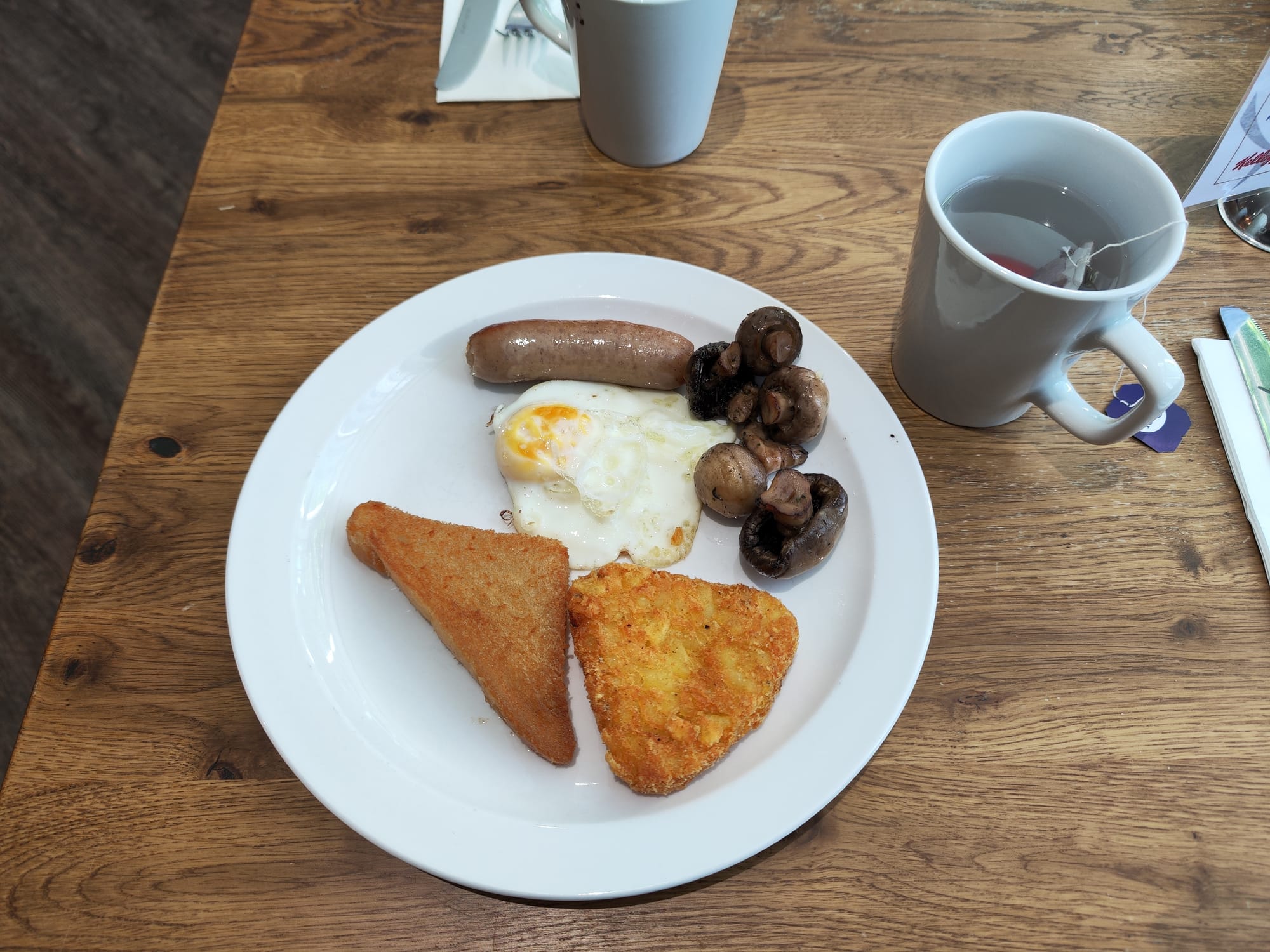 Im Frühstücksraum wird ein typisches Full English Breakfast serviert. Ich verzichte auf Baked Beans und Speck, freue mich aber über Hash Browns, Ei und gebratenen Champignons. So darf mein Frühstück gerne häufiger aussehen. Besonders die Champignons finde ich zum Frühstück einfach lecker. Auf die Toast-Ecke und Würstchen verzichte ich demnächst aber, beides nicht mein Geschmack.