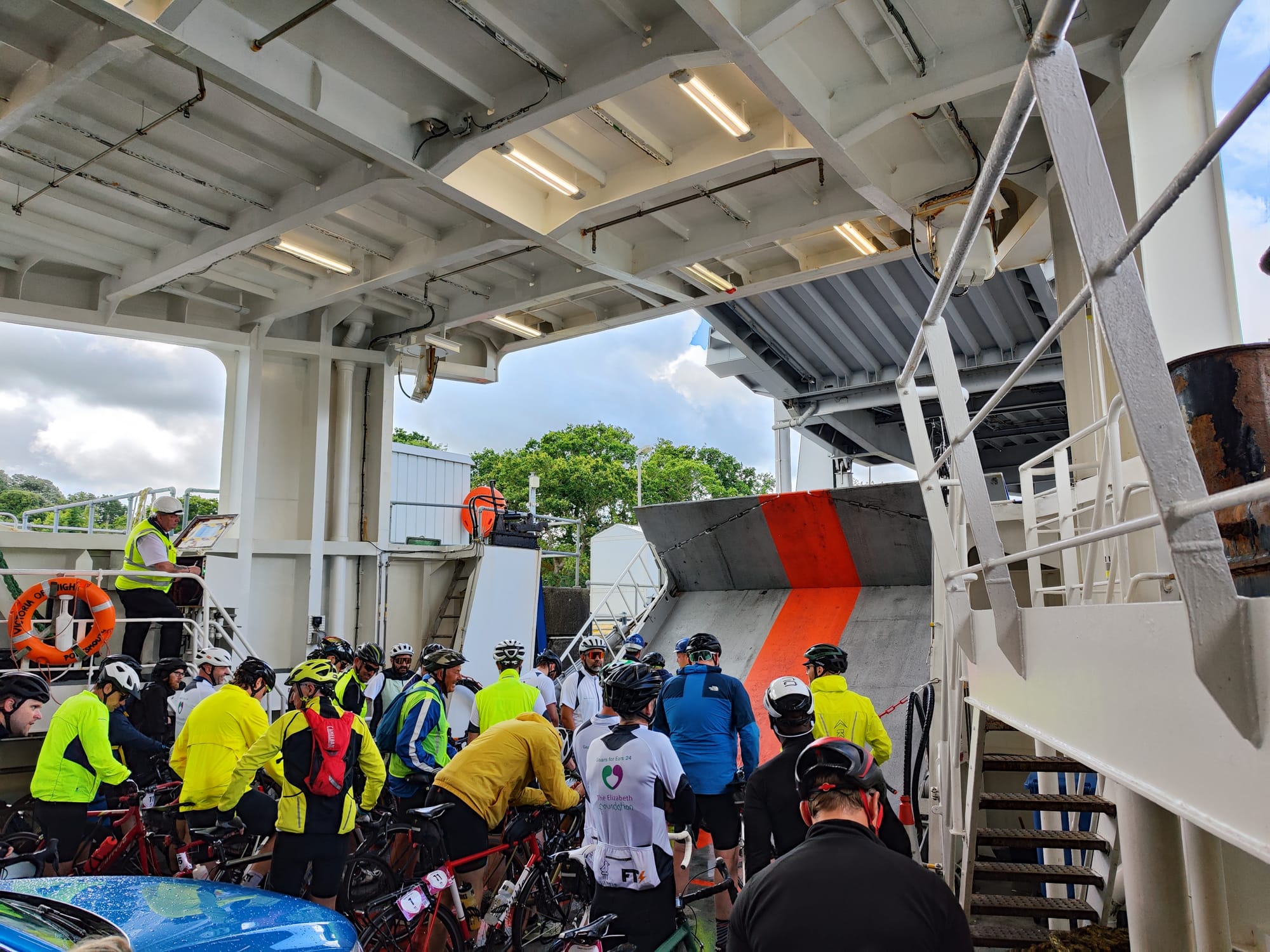 Da wir die letzten waren die auf die Fähre gelassen wurden, mussten die Fahrräder spontan wieder abgeladen werden um sich durch die Autos auf dem Lade-Deck zu schlängeln. Und da das Ladepersonal das Deck auch schon fast komplett verlassen hatte, hatten wir etwas Mühe herauszufinden wo und wie wir unsere Fahrräder sichern sollen. Da an der Ladeluke schon genügend Fahrräder gestapelt waren, lagen sie schlussendlich relativ ungesichert auf dem Boden.
