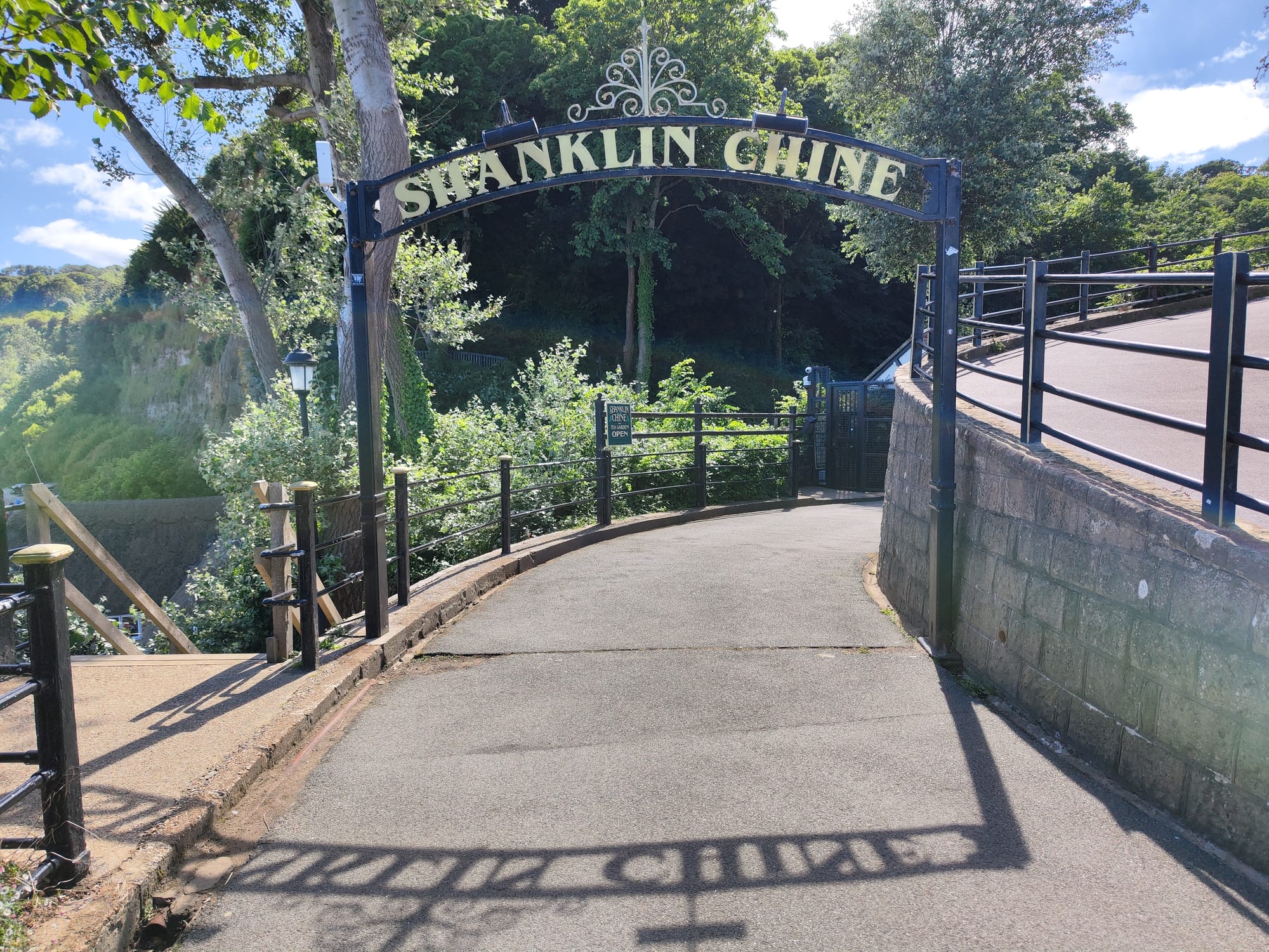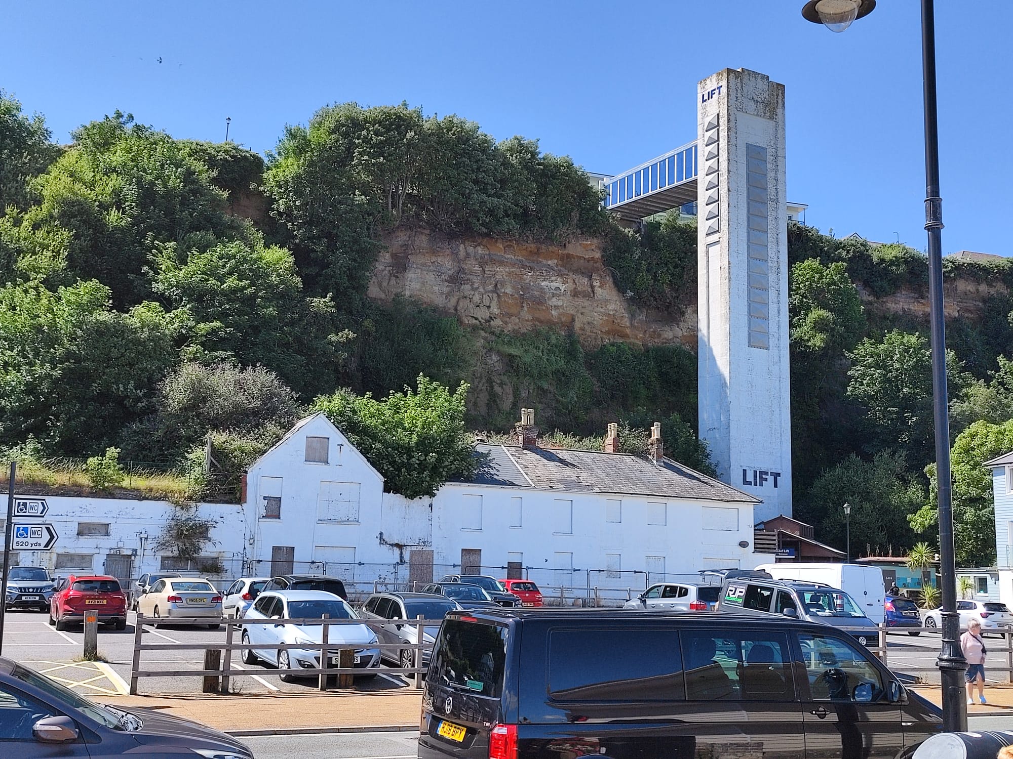Aber der Weg um an den Strand zu kommen ist leider wegen einer Baustelle gesperrt. Ohne die Benutzung des Cliff Lift würde man nur über Umwege die Klippen herunterkommen. In der Aufzugskabine sitz ein netter Mann an einem Klapptisch der einen gerne für 1 Pfund runter- und auch wieder hochfährt.