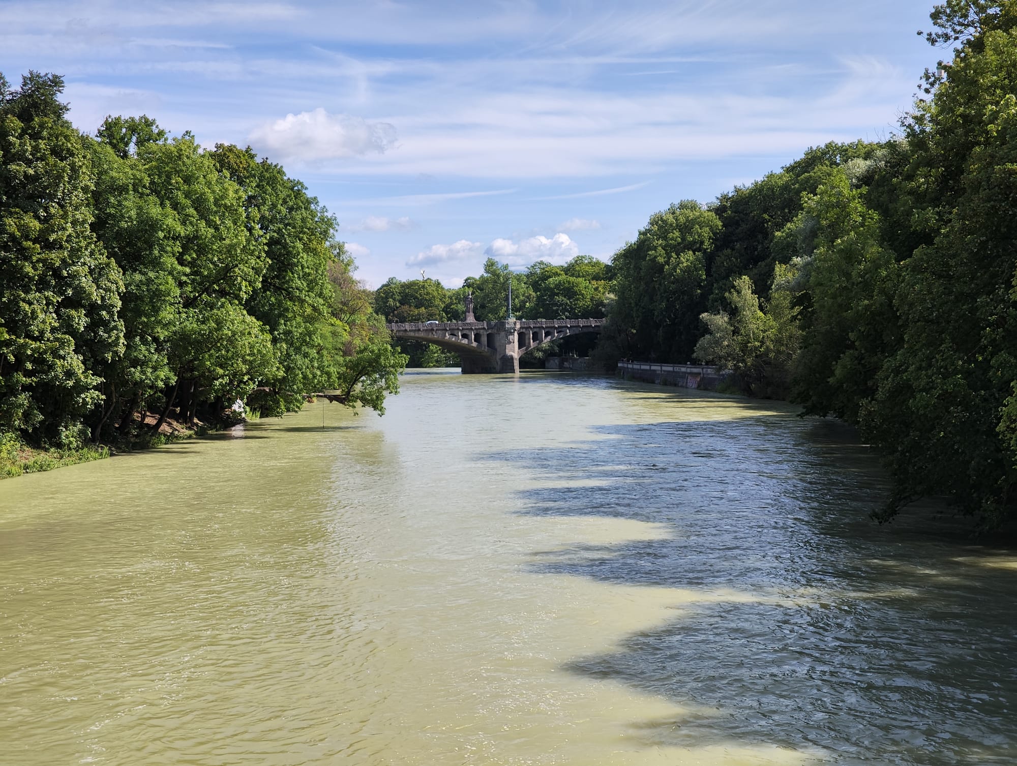 Ich weiß ja nicht wie hoch der Pegel der Isar sonst so ist, aber sie scheint reichlich gefüllt zu sein. Es sieht wirklich spektakulär aus. Aber auch wenn die Sonne scheint, Badewetter ist so früh am Morgen noch nicht.