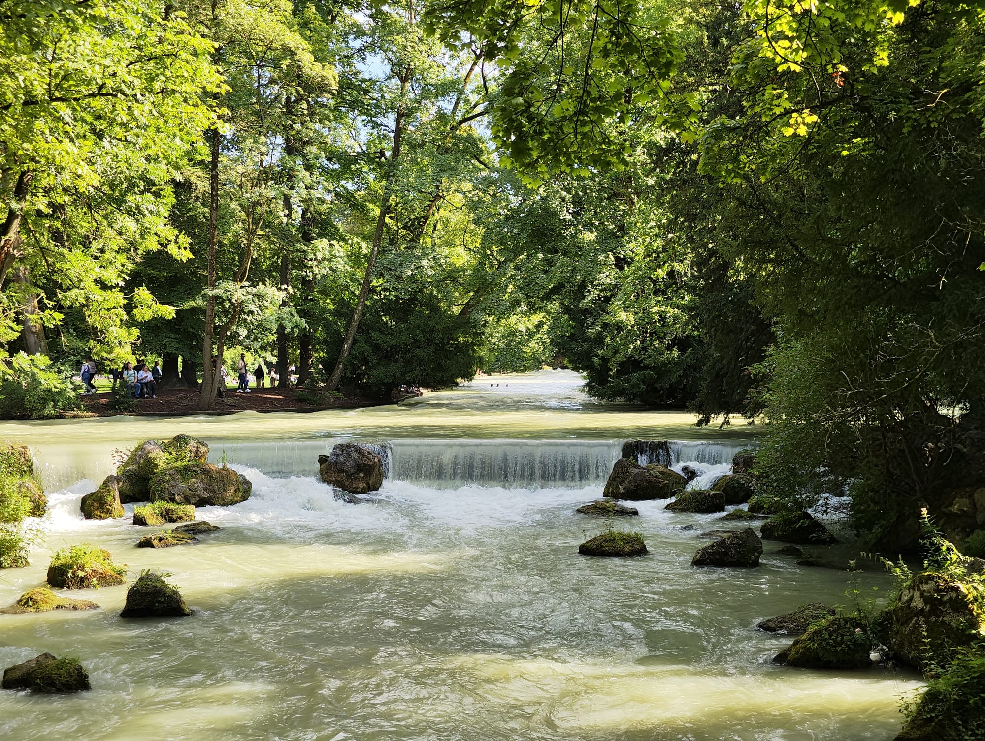 Der Englischen Garten selbst, ist wirklich schön. Und bei dem tollen Wetter liegen unheimlich viele entweder am Ufer des Eisbachs oder lassen sich den Bach herunter treiben.