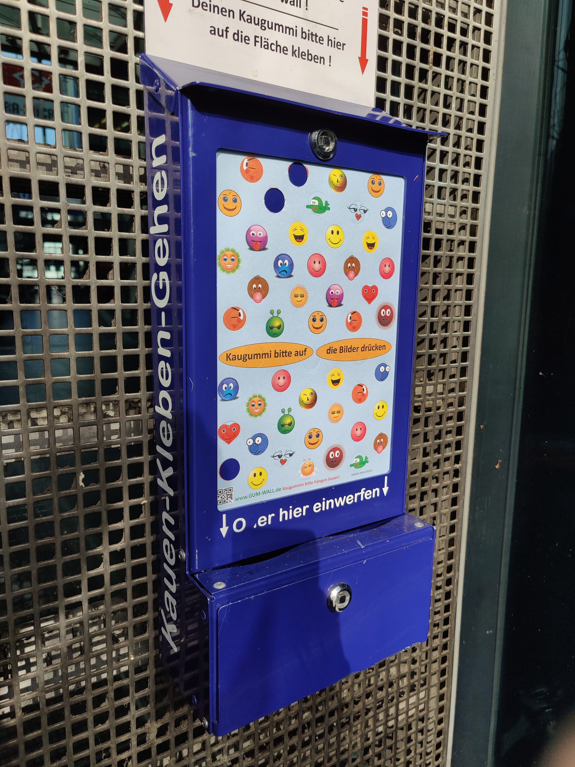Am Eingang des Bahnhofs sehe ich eine Box auf die man seine Kaugummis kleben kann, ist mir gestern gar nicht aufgefallen. Gibt es so etwas Ähnliches nicht auch im Phantasialand?