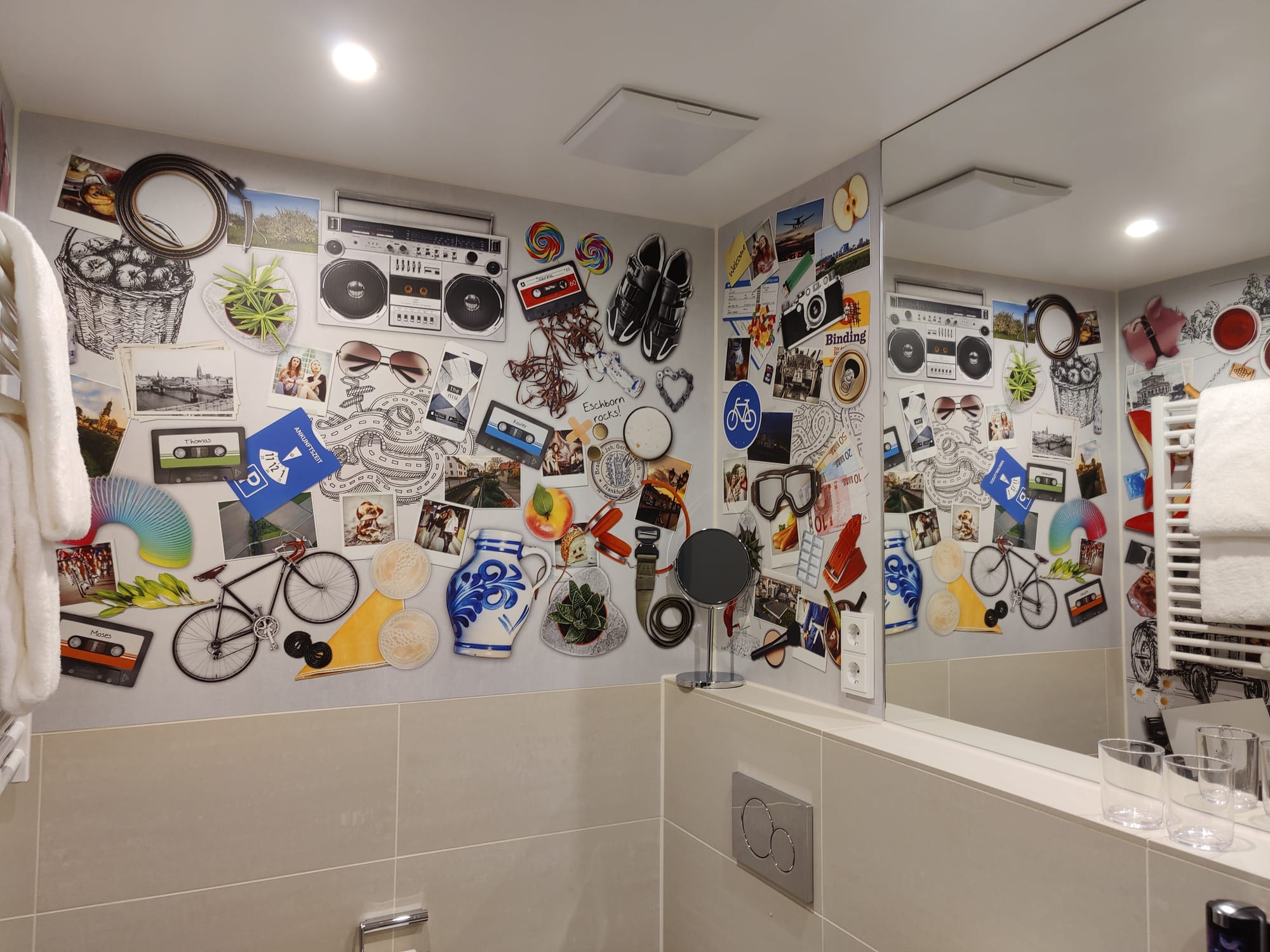 Dafür ist die Tapete im Bad doch sehr unruhig, aber immerhin ist ein Fahrrad mit drauf.