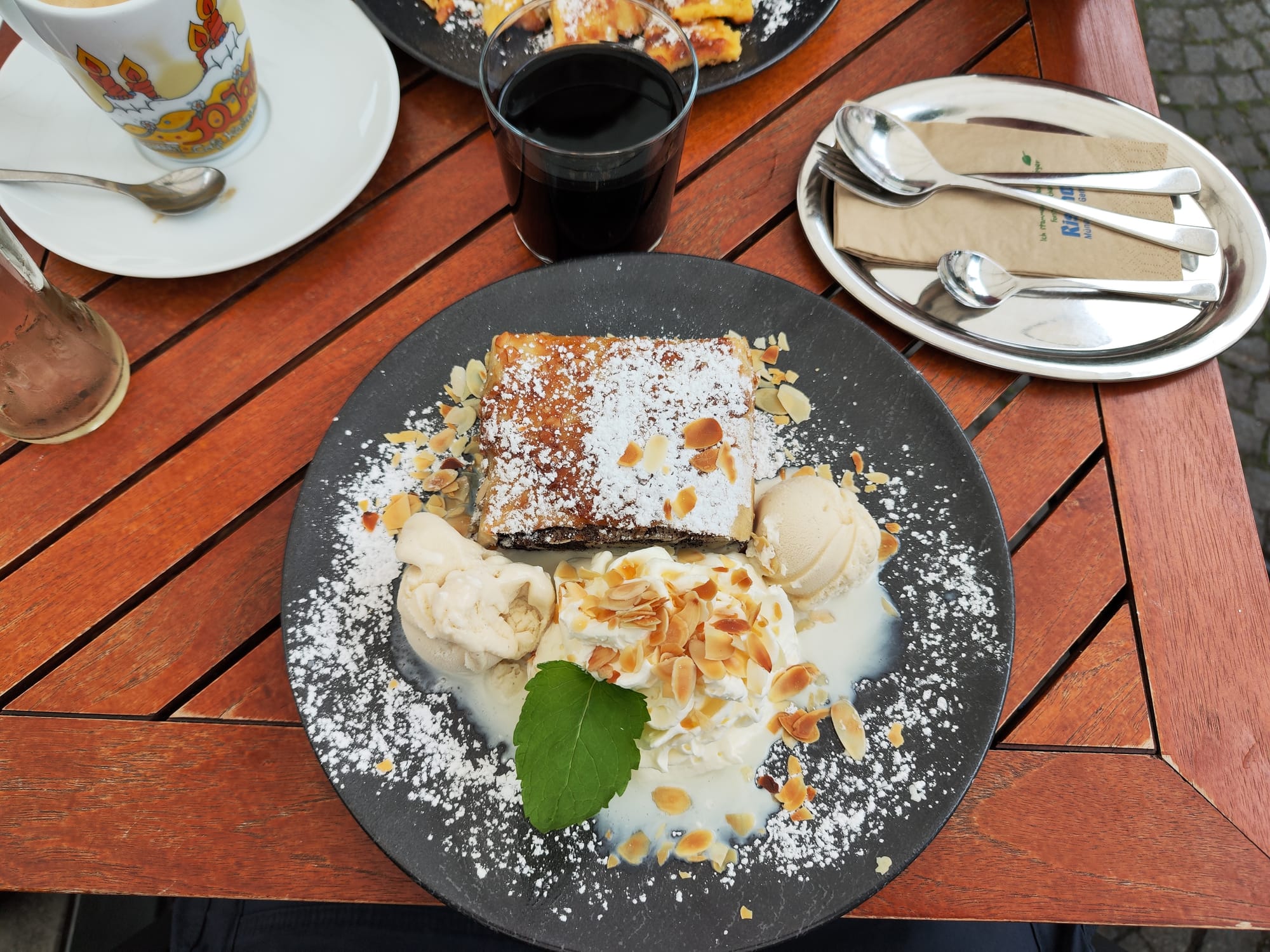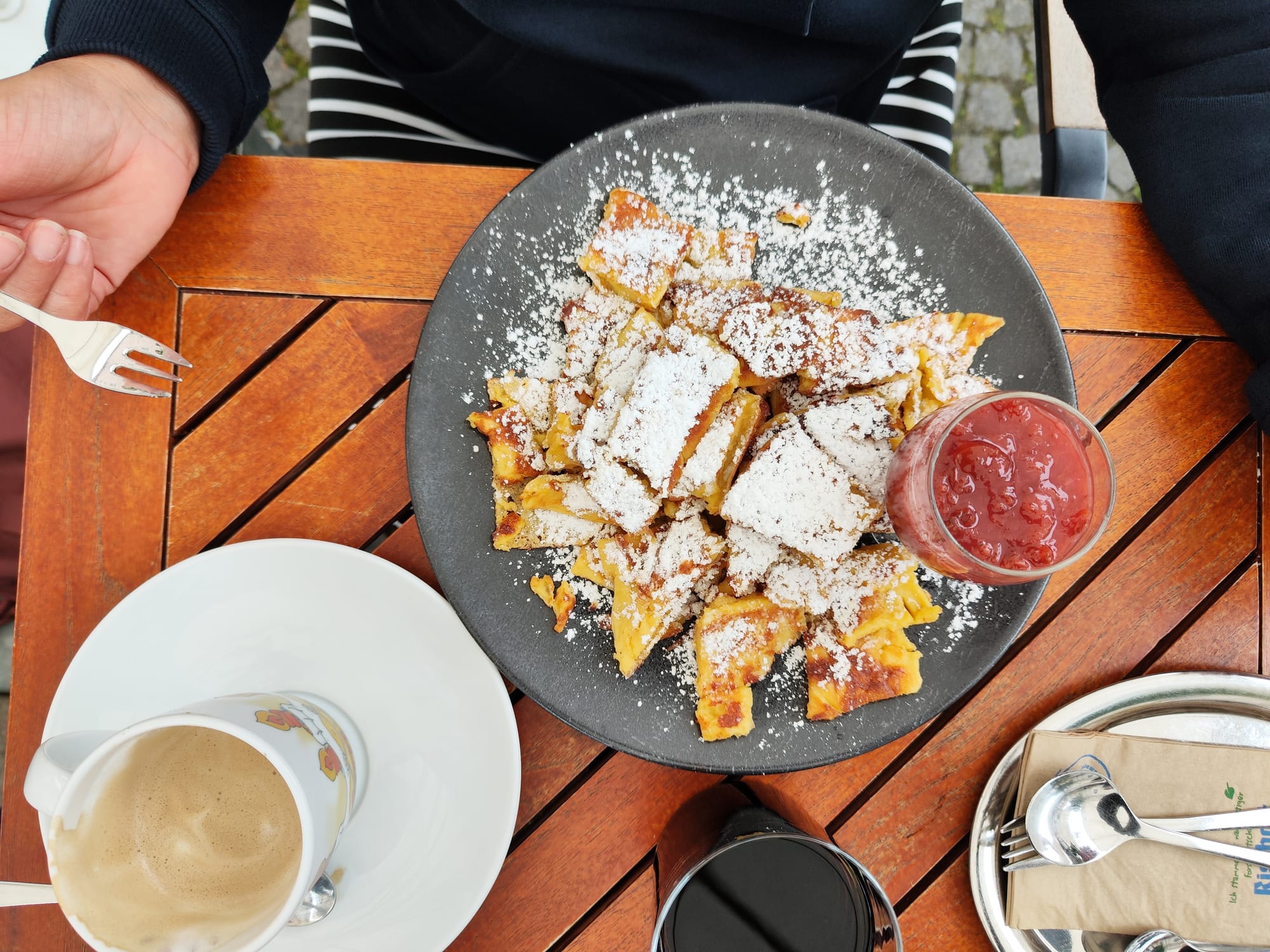 Zurück am Viktualienmarkt gönnen wir uns im Café Kaiserschmarrn (normalerweise das Rischart Café, aber scheinbar saisonal ein Kaiserschmarrn Café) noch einen sehr leckeren Mohnstrudel und einen Kaiserschmarren, bevor es wieder zurück zum Hotel geht.