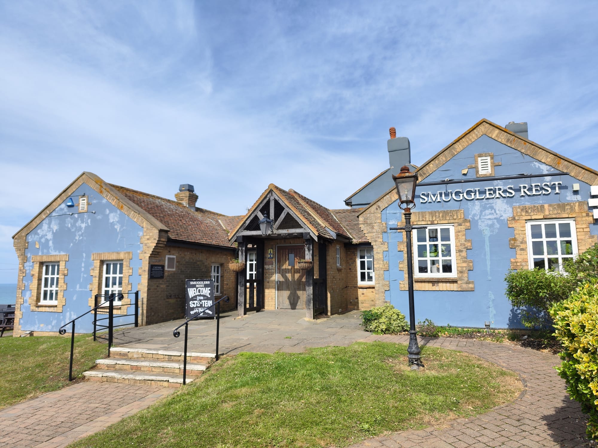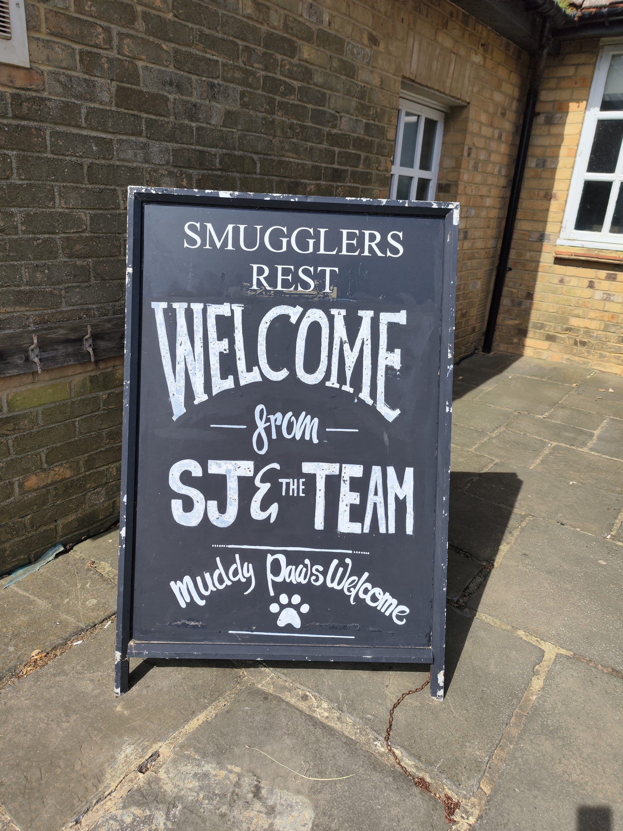 Wir machen kurz Rast am Pub "Smugglers Rest", ich fand das letzte Mal die Aussicht von da schon gut. Wobei der Pub auch einladend aussieht, nur um diese Zeit noch geschlossen ist. Auf jeden Fall haben sie dort sicher ein Herz für Schmuggler mit dreckigen Stiefeln und ihren genauso so schmutzigen Haustieren.