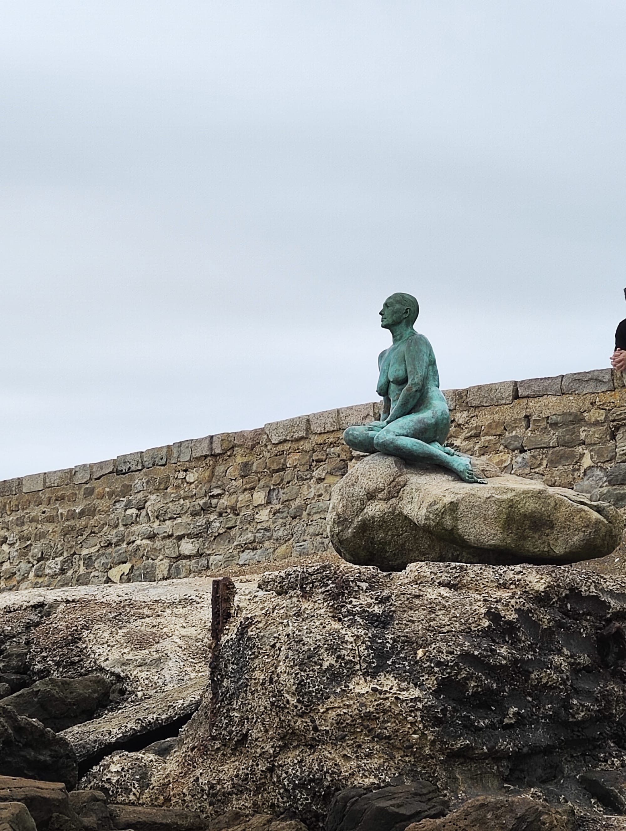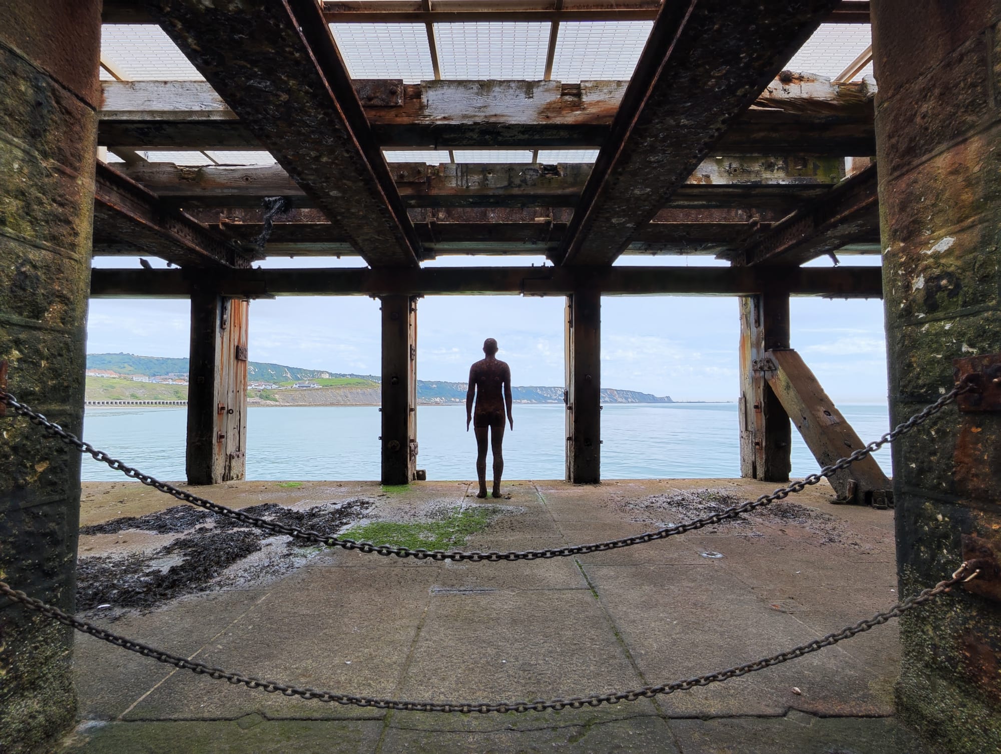 Auch ansonsten scheint Folkestone eine bei Künstlern beliebte Gegend zu sein. Neben dem Schriftzug auf dem Leuchtturm, steht unter dem Hafen-Arm z. B. eine Skulptur mit dem Titel "Another Time XVIII". Solange der Meeresspiegel nicht zu hoch ist, kommt man über eine Treppe in die Nähe der Skulptur und ich habe sie nur zufällig entdeckt. Außerdem gibt es, in Anlehnung an die die kleine Meerjungfrau in Kopenhagen, am Strand die Folkestone Mermaid, für die eine einheimische Frau Modell gesessen hat.
