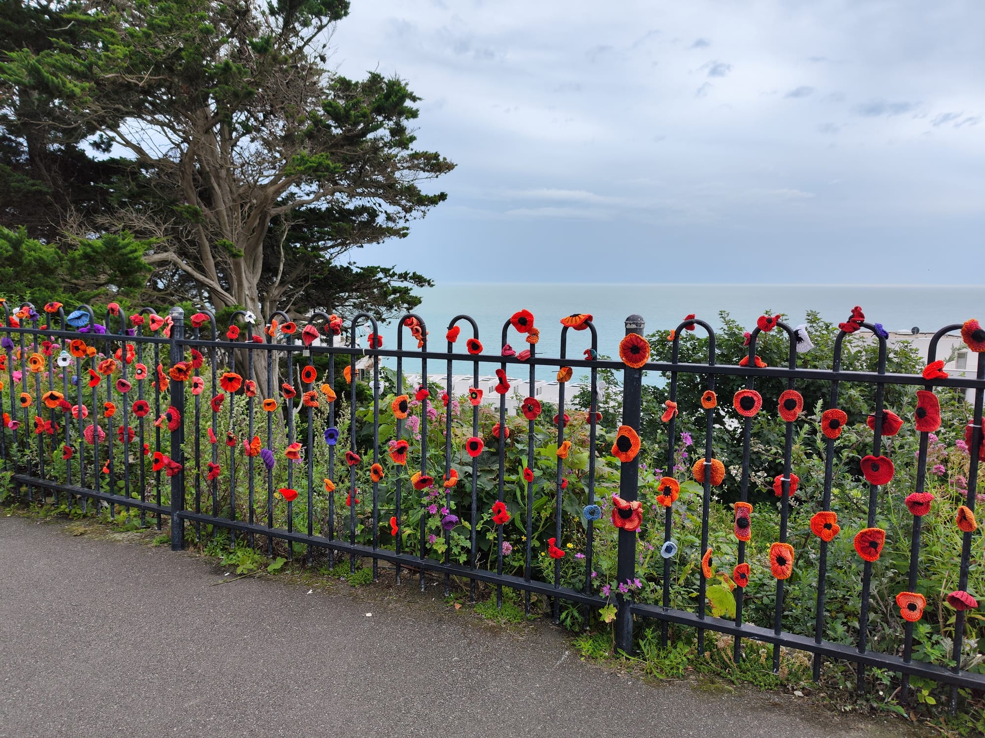 In der Stadt kommen wie an einem Gedenkbogen, dem "Step Short Memorial", vorbei. Am Zaun sind unzählige gehäkelt "Remembrance Poppies" angebracht. Auf diese stilisierten künstlichen Mohnblumen trifft man immer wieder in England, als ein Symbol des Gedenkens an die zahllosen Kriegsopfer. Insbesondere an die in den beiden Weltkriegen gefallenen Soldaten.