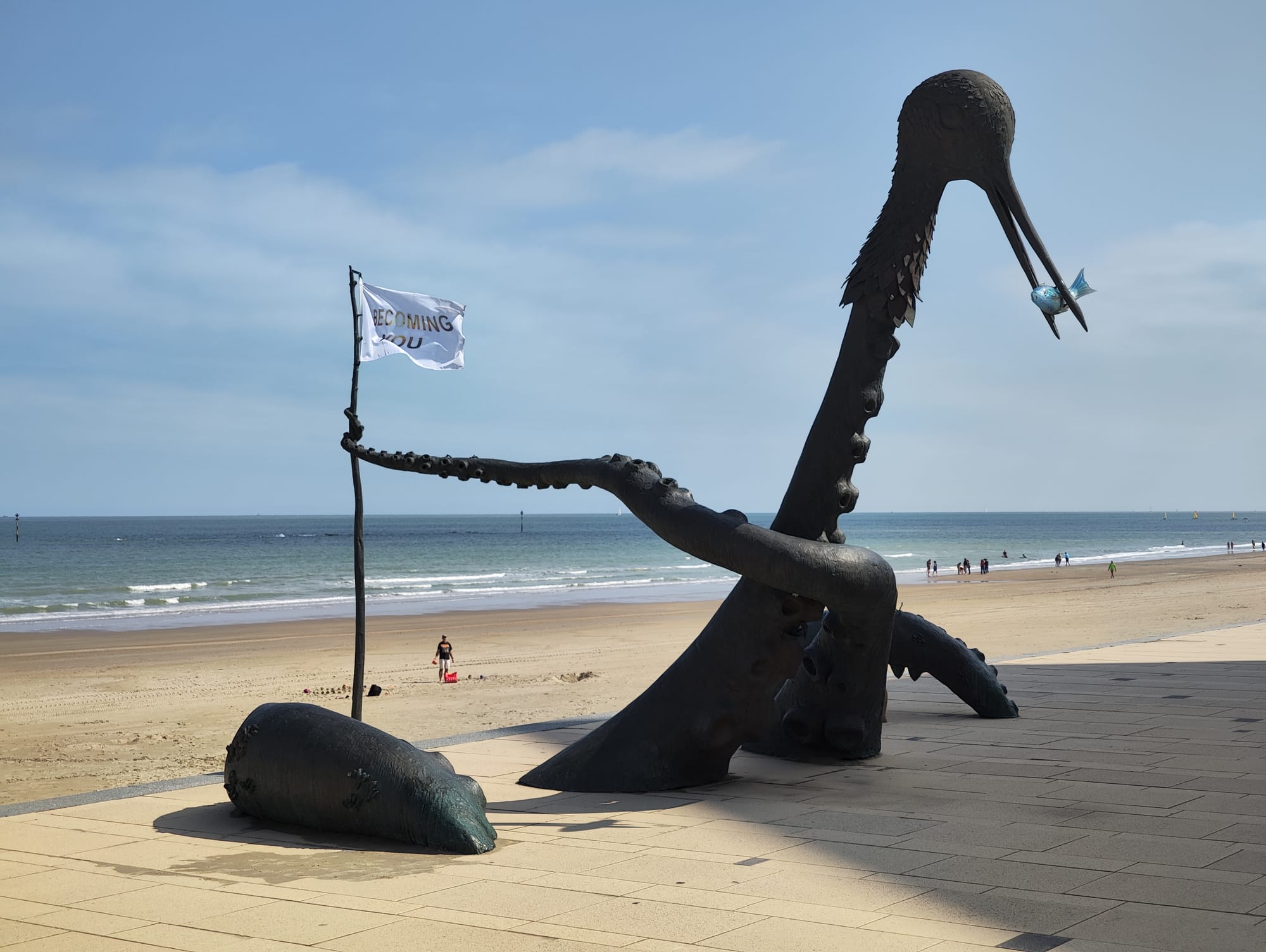 Wir fahren an einer ziemlich spektakulären Kunst-Installation vorbei, Kraken-Arme die aus dem Boden ragen. Erst auf dem zweiten Blick sehe ich, dass der Kopf des Kranken am Strand aus dem Sand guckt. Da hat der Künstler ja eine witzige Idee gehabt. Gut das ich noch ein Foto von den Vögeln machen wollte, und die Perspektive wechseln musste.