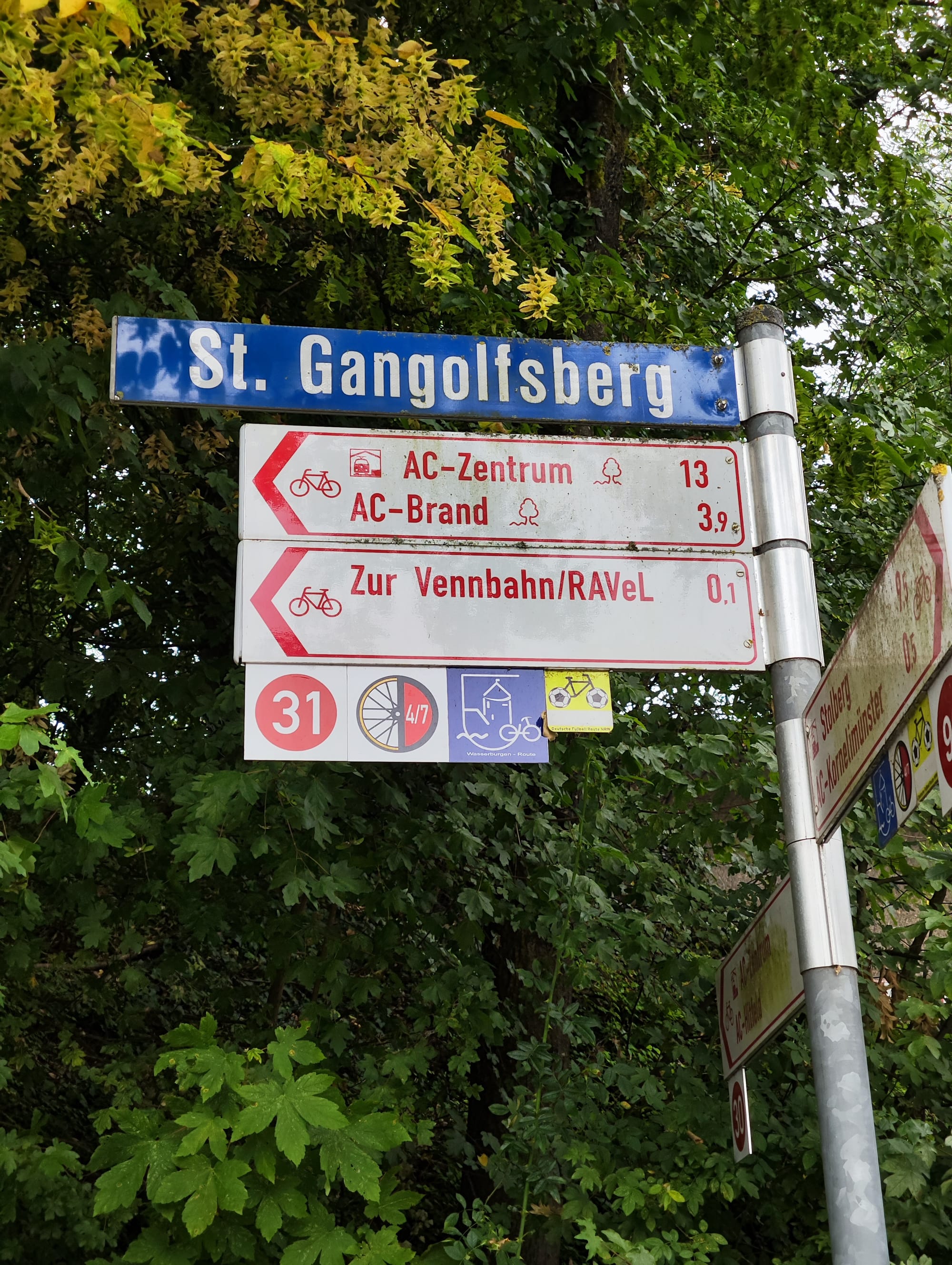 Die erste Abzweigung in Richtung Venbahn-Radweg, die das Navi vorgibt, ist gleich gesperrt. Also einen Umweg in kauf nehmen und die Sperrung so gut es geht umfahren. Was darin endet, das schon wieder eine Steigung hochgestrampelt werden muss. Waren es gestern 694 m Anstieg gesamt, und fast nur auf den letzten 20 km, so werden es heute 672 m, aber über die gesamte Strecke verteilt. Der Radweg hat eine leichte aber sehr kontinuierliche Steigung. Um genau zu sein, die Starthöhe in Stolberg liegt bei ca. 230 m, das Ziel Bütgenbach liegt auf ca. 580 m.