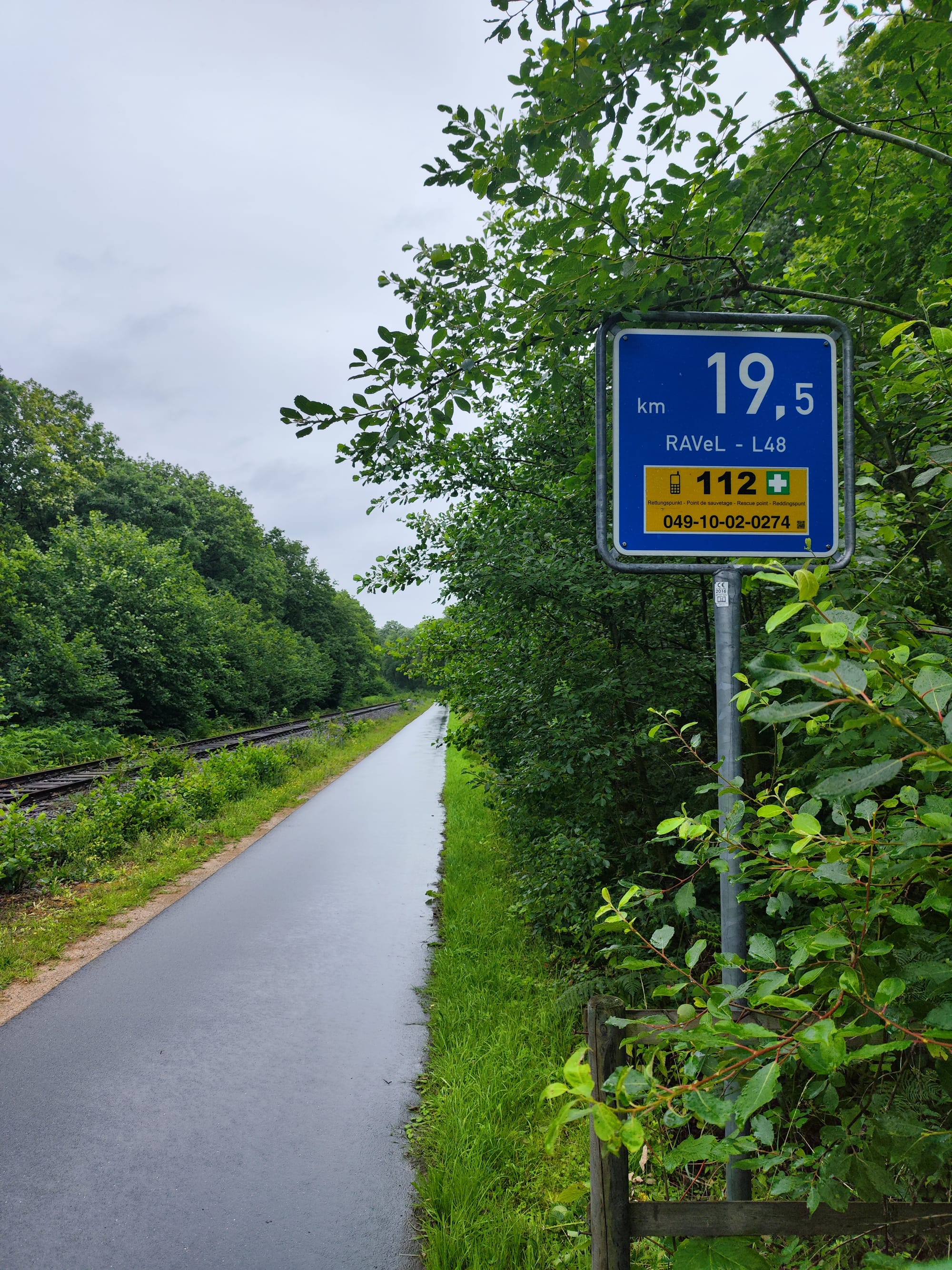Die Strecke ist schön und führt fast die ganze Zeit durch Wälder, wobei ich persönlich den belgischen Teil der Strecke ein bisschen abwechslungsreicher gefunden habe. Spätestens nach jedem Kilometer steht ein Schild mit der Kilometerzahl und der Notrufnummer. Hin und wieder stehen kleine Hütten zum rasten in der Form von Bahnwagen am Wegesrand. Ab und an, und meiner Meinung nach viel zu selten, findet sich auch ein kleines Café oder ein Biergarten. In Belgien gibt es an der Strecke eine Railbike-Vermietung (eine Art Draisine). Und obwohl das Wetter wirklich nicht gut ist sind unheimlich viele Gruppen unterwegs.