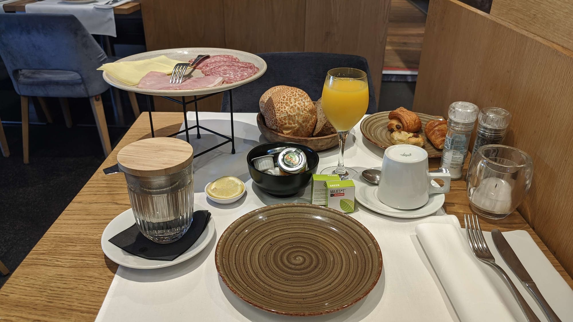 Hier ist es etwas schicker, man bekommt sein Frühstück an den Tisch gebracht.