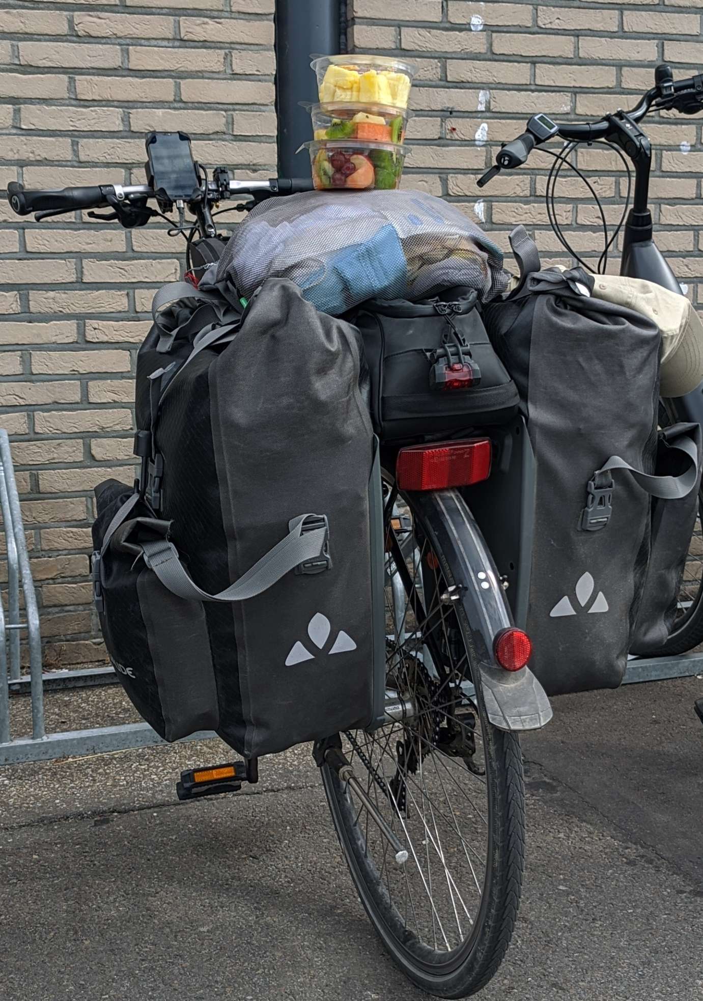 Davon angespornt trete ich ordentlich in die Pedale, aber auch mit fast 30 km/h bekomme ich ihn nicht abgehängt. Irgendwann überholt er mich und spricht mich an. Die nächsten 5 km reden wir über Fahrradtouren, er fährt nächste Woche über die Alpen nach Italien.