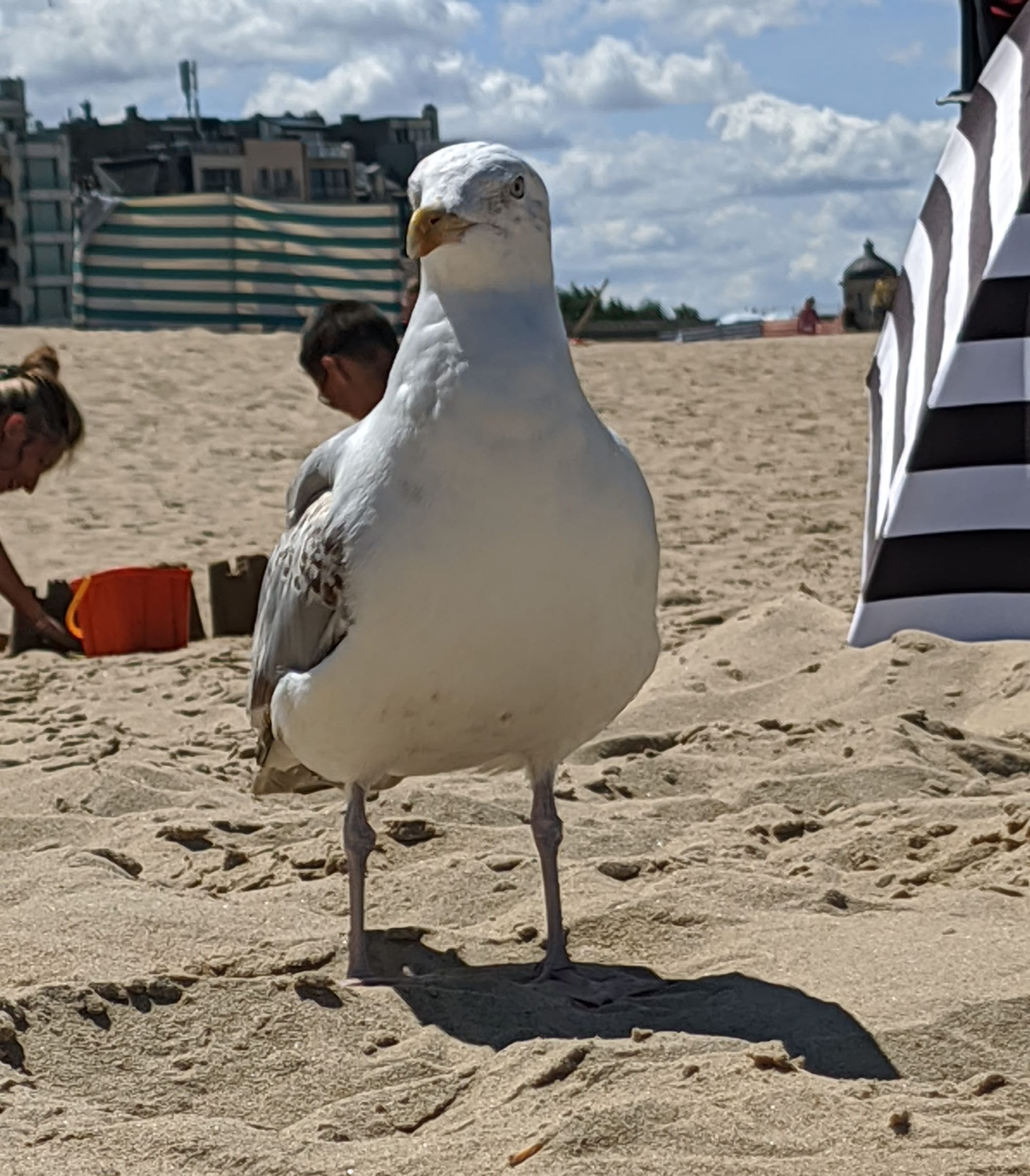 Keine Armeslänge entfernt bin ich umringt von mindestens vier Möwen. Und das sind richtig große Möwen und sie scheinen gar keine Scheu zu haben.
