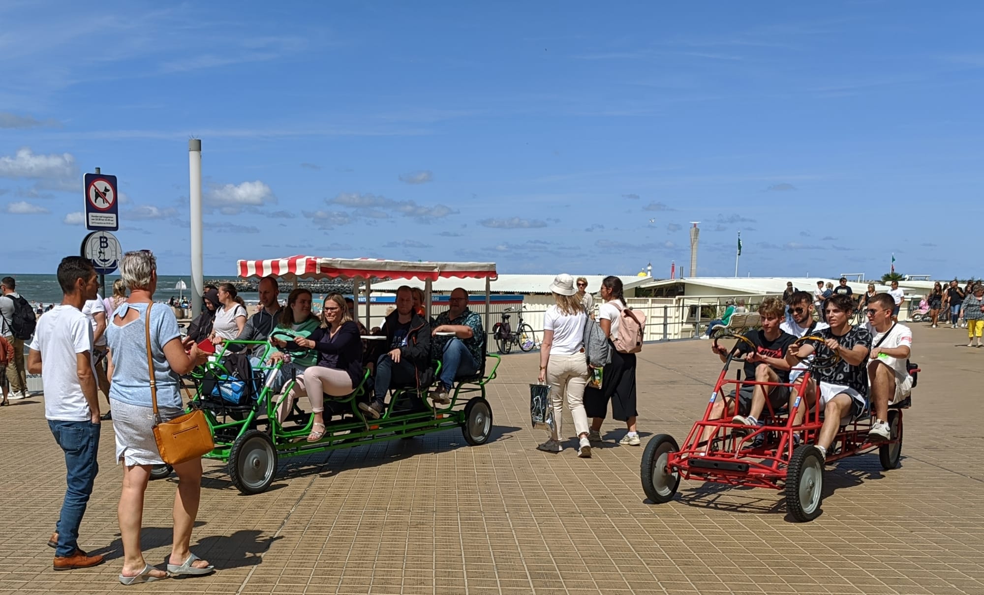 Aber da ich ja auch nicht auf dem Zimmer versauern will, bin ich natürlich gleich wieder unterwegs ich gehe an der Strandpromenade lang und überall kommen mir komische Fahrräder entgegen.