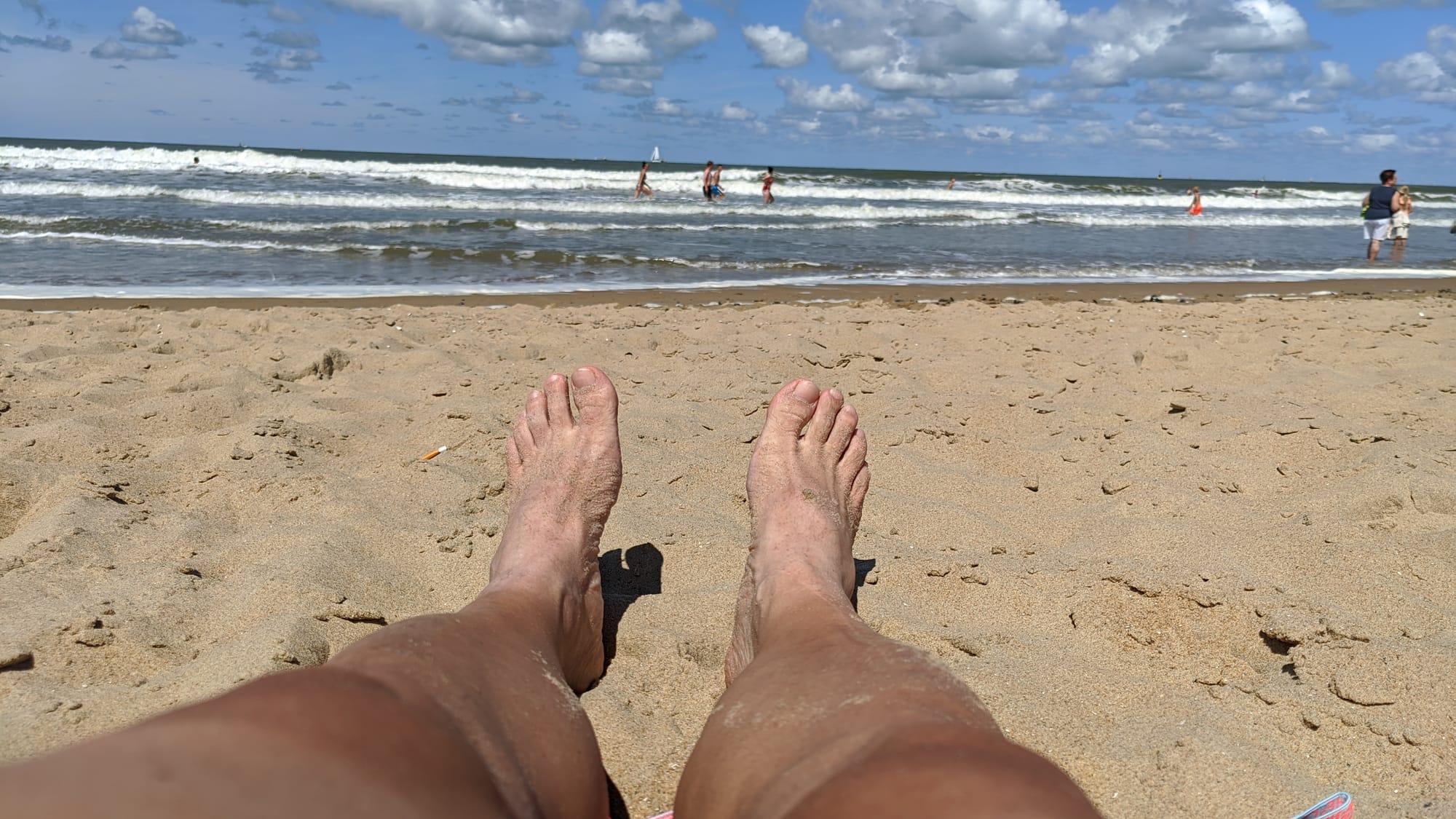 Es ist herrlich, der Sand ist toll und das Wasser rauscht angenehm. Es ist nicht all zu voll und nachdem der Tag erst etwas diesig angefangen hatte, brennt mir jetzt die Sonne auf den Pelz.