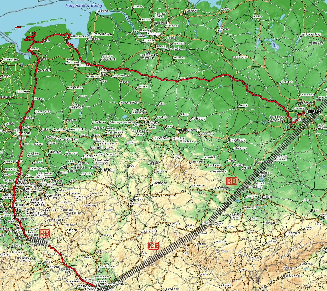 Hier noch eine vereinfachte Übersicht der Tour. Es sind nur die Wege zu den Nachtlagern und auf Juist eingezeichnet, nicht die tatsächlichen Fahrten. Das würde gerade in der Gegend um Norden herum etwas unübersichtlich werden.
