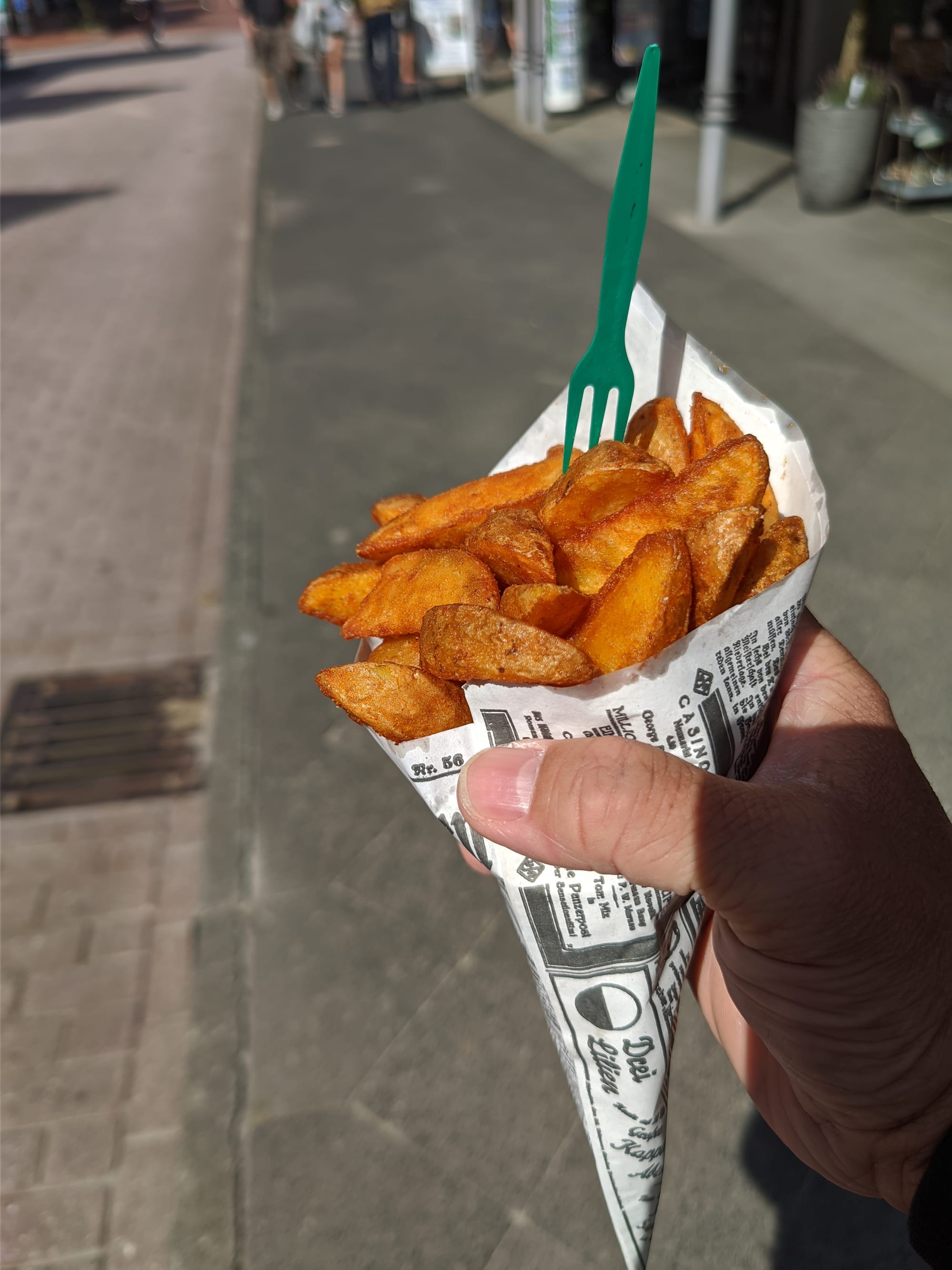 Gerne würde ich mir den Strand angucken aber irgendwo muss man Abstriche machen, denn jetzt habe ich Hunger. Und da ich ja mehr "Ja" sagen wollte, und überall Backfisch und Co. angeboten wird, versuche ich es mal mit einer Tüte Fish and chips. Bzw. wie es hier heißen würde Kibbeling und Fritten.