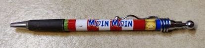 Der Stift ist angestrichen wie ein Leuchtturm und es steht "Moin Moin" drauf.