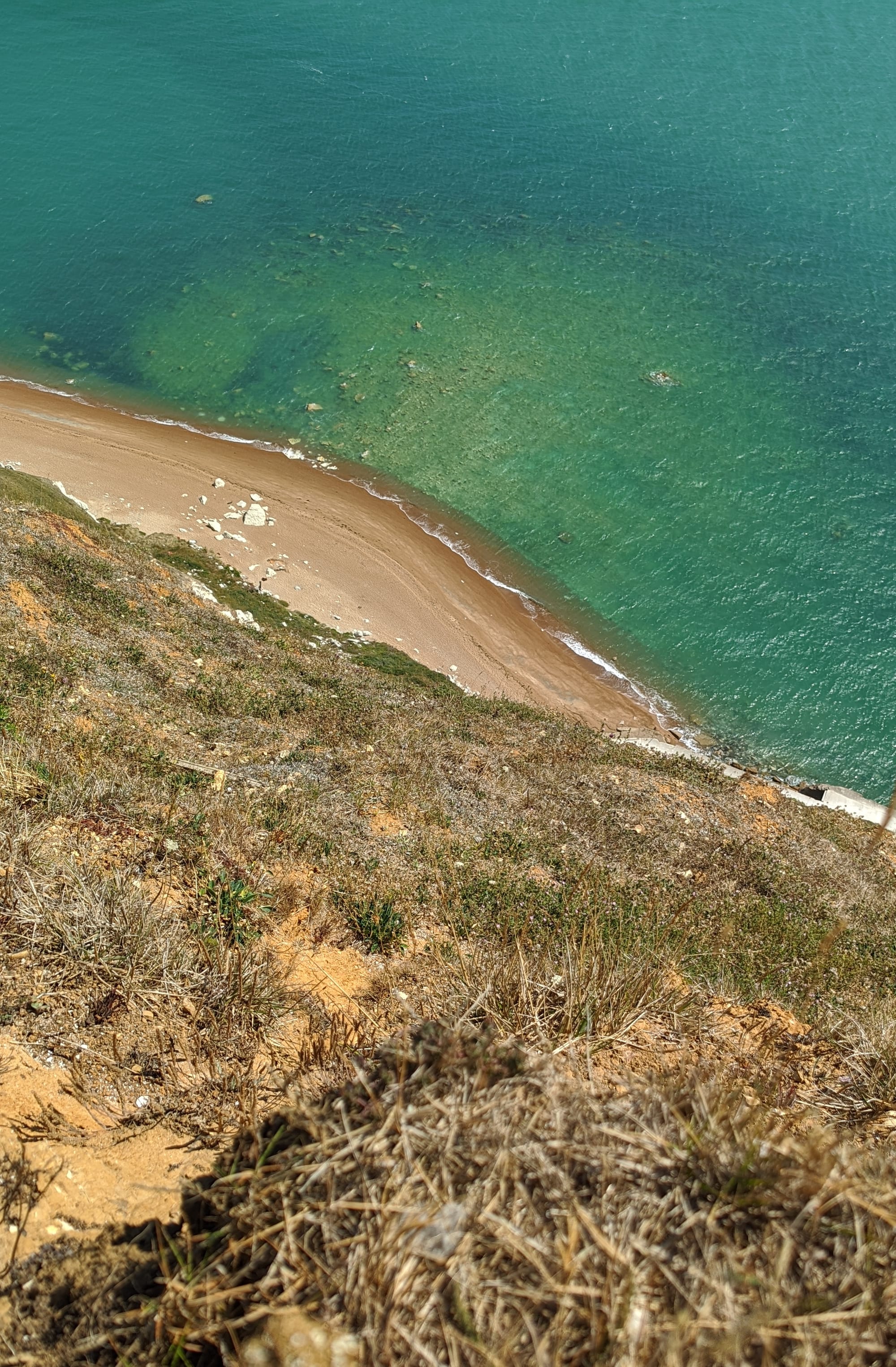 An einer schönen Stelle bleibe ich stehen um ein Foto zu machen. Da ich ganz oben auf den Klippen stehe wird mir ganz blümerant als ich, die bestimmt über 100 m, runter in den Abgrund gucke.