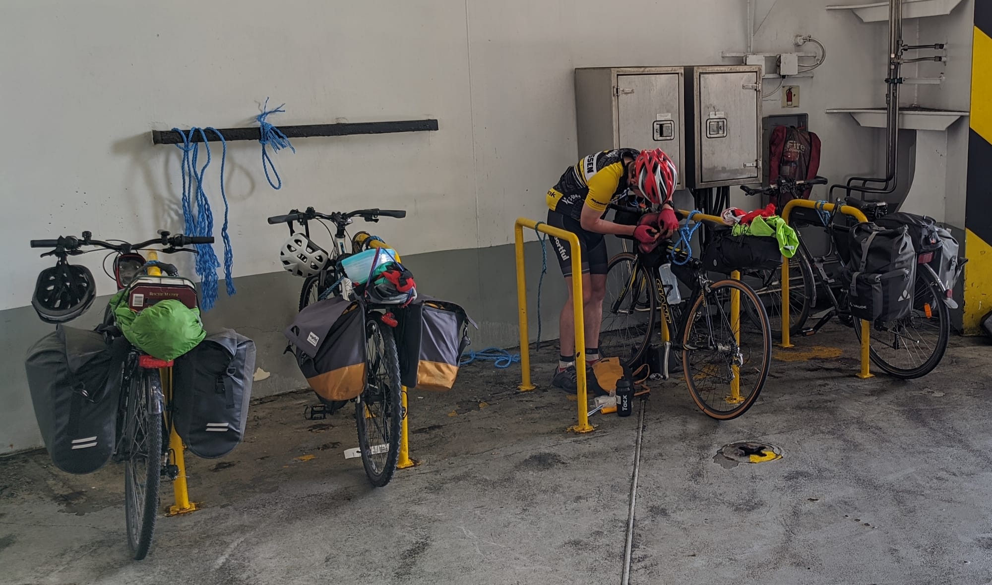 Wir bekommen eine Parkbucht zugewiesen, in der wir unsere Fahrräder festbinden dürfen.