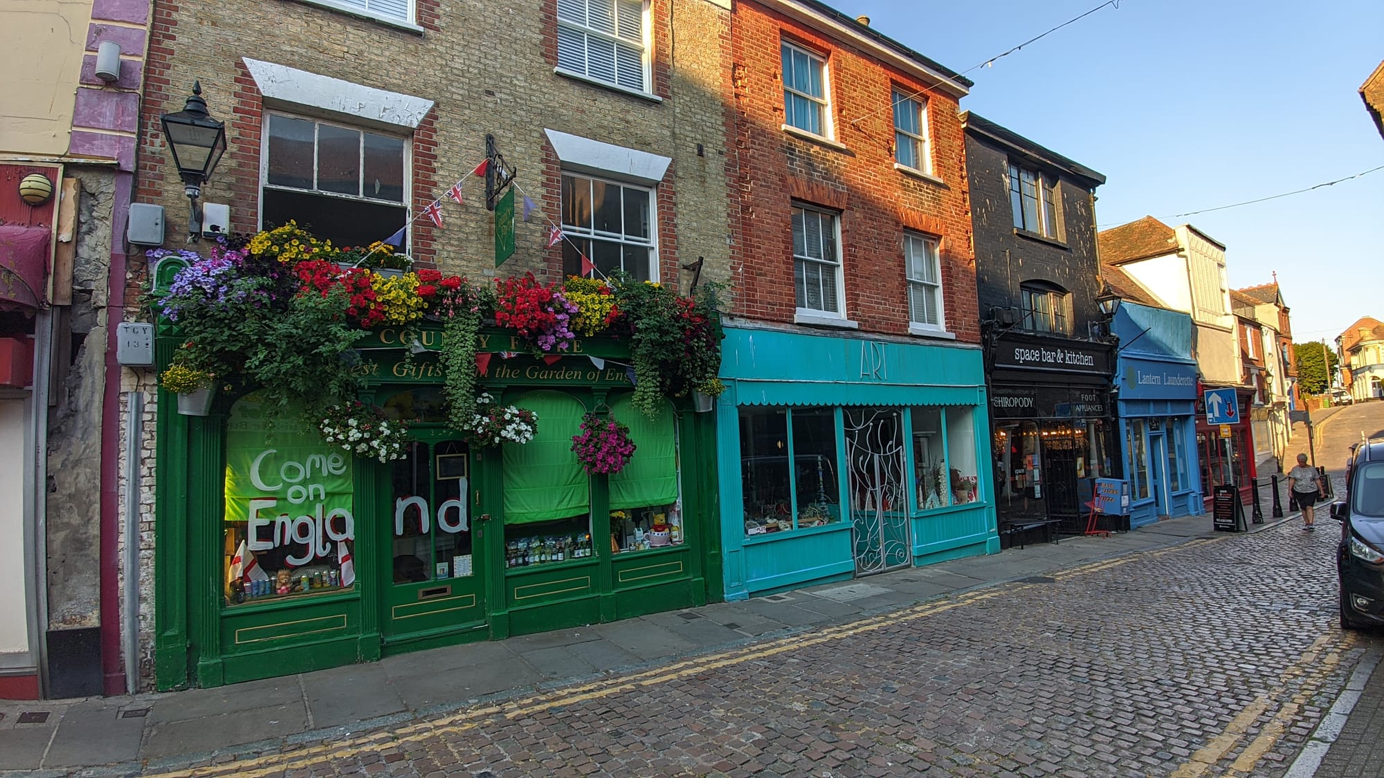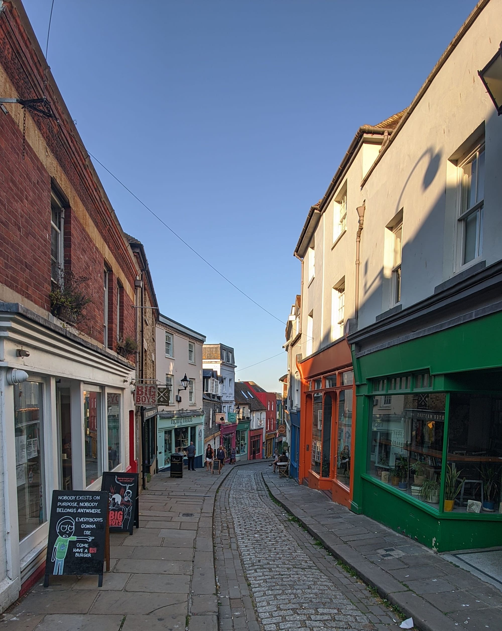 Hoch in die Stadt führt eine kleine niedliche Gasse mit schnuckeligen Geschäften, Restaurants und Pubs. Leider bin ich spät dran und die meisten Geschäfte haben schon zu.