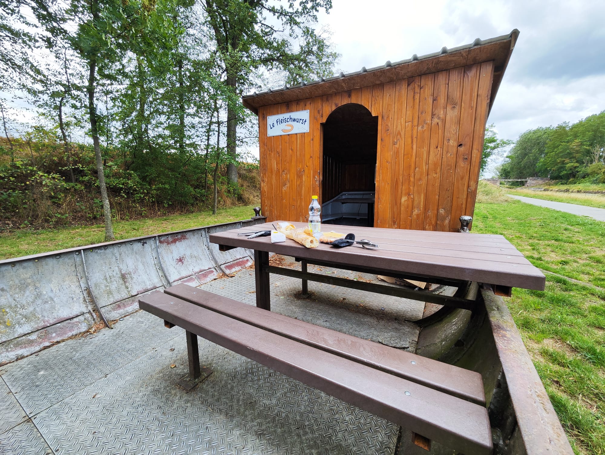 An einem ausrangierten Boot, das zu einem Rastplatz umfunktioniert wurde, kehren wir zum Mittagessen ein. Das Boot hat den passenden Namen "Le Fleischwurst".