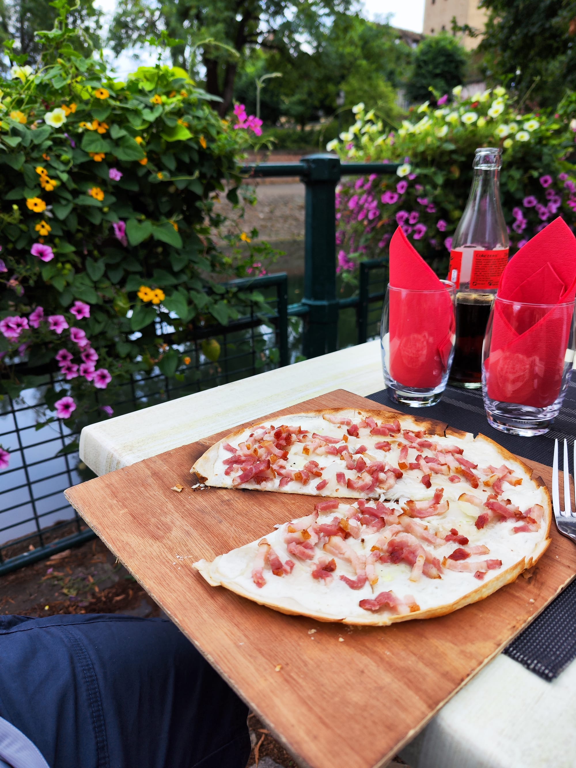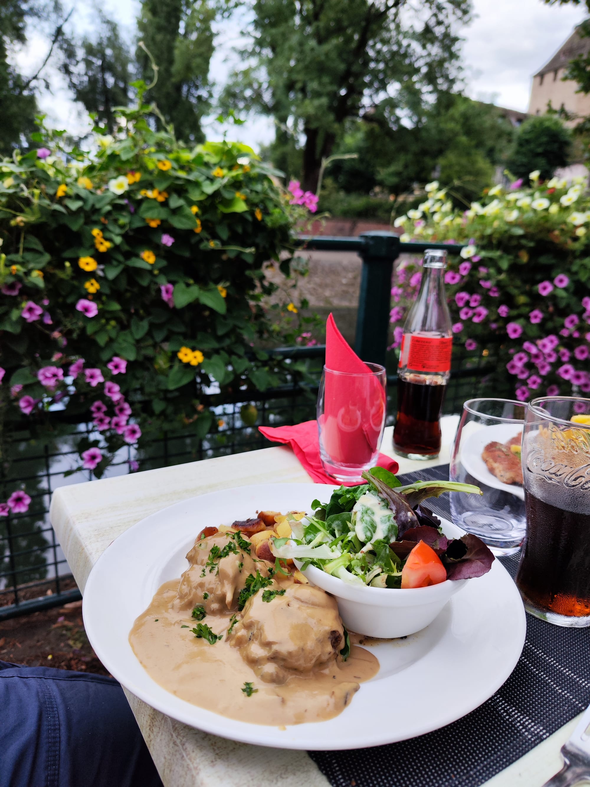 In einem Restaurant direkt am Ufer der Ill wird zu Abend gegessen. Es gibt, Wienerschnitzel mit Pommes und Salat, Flambée traditionnelle, Fleischkiechle mit Bratkartoffeln und Tiramisu.