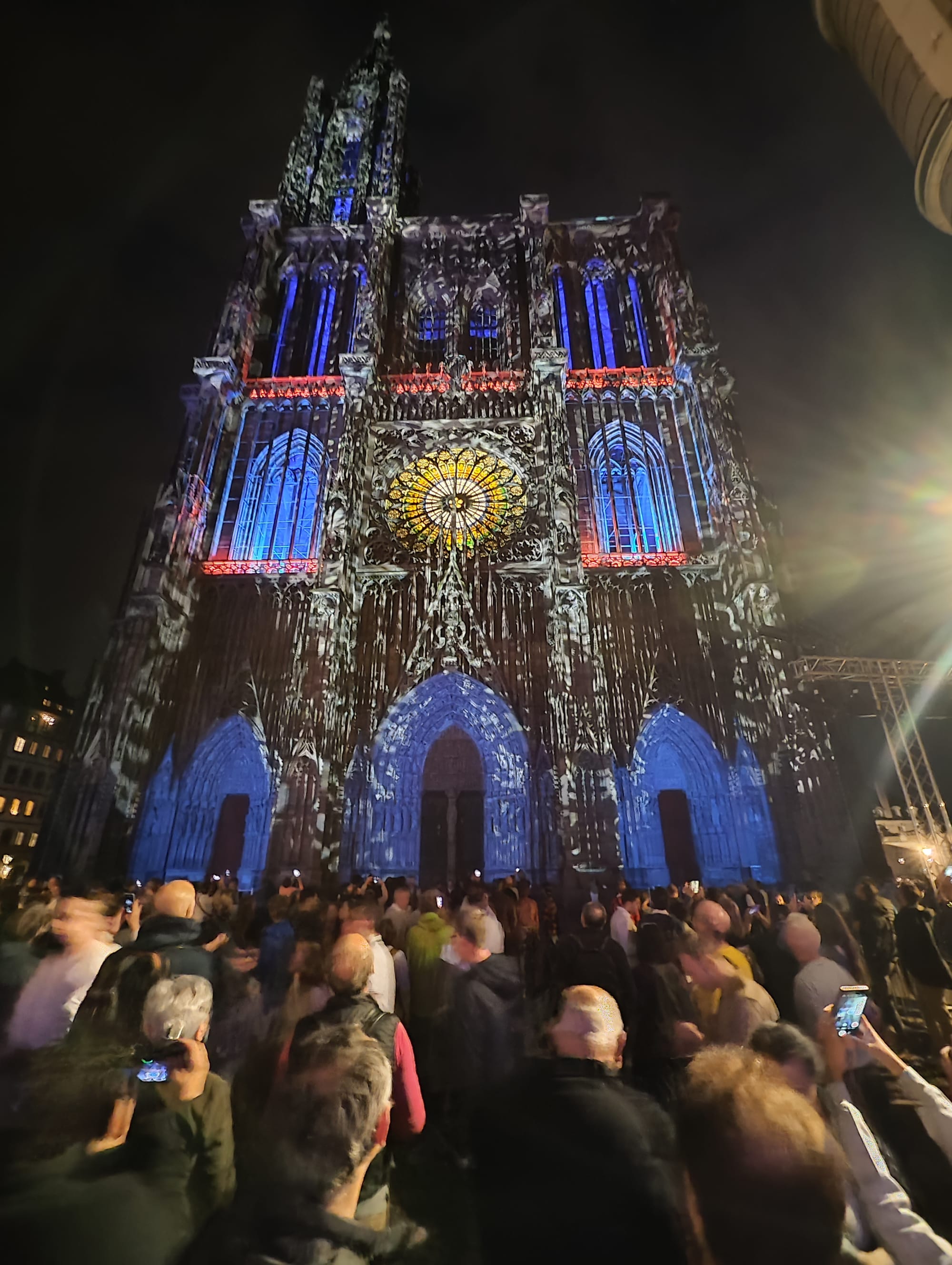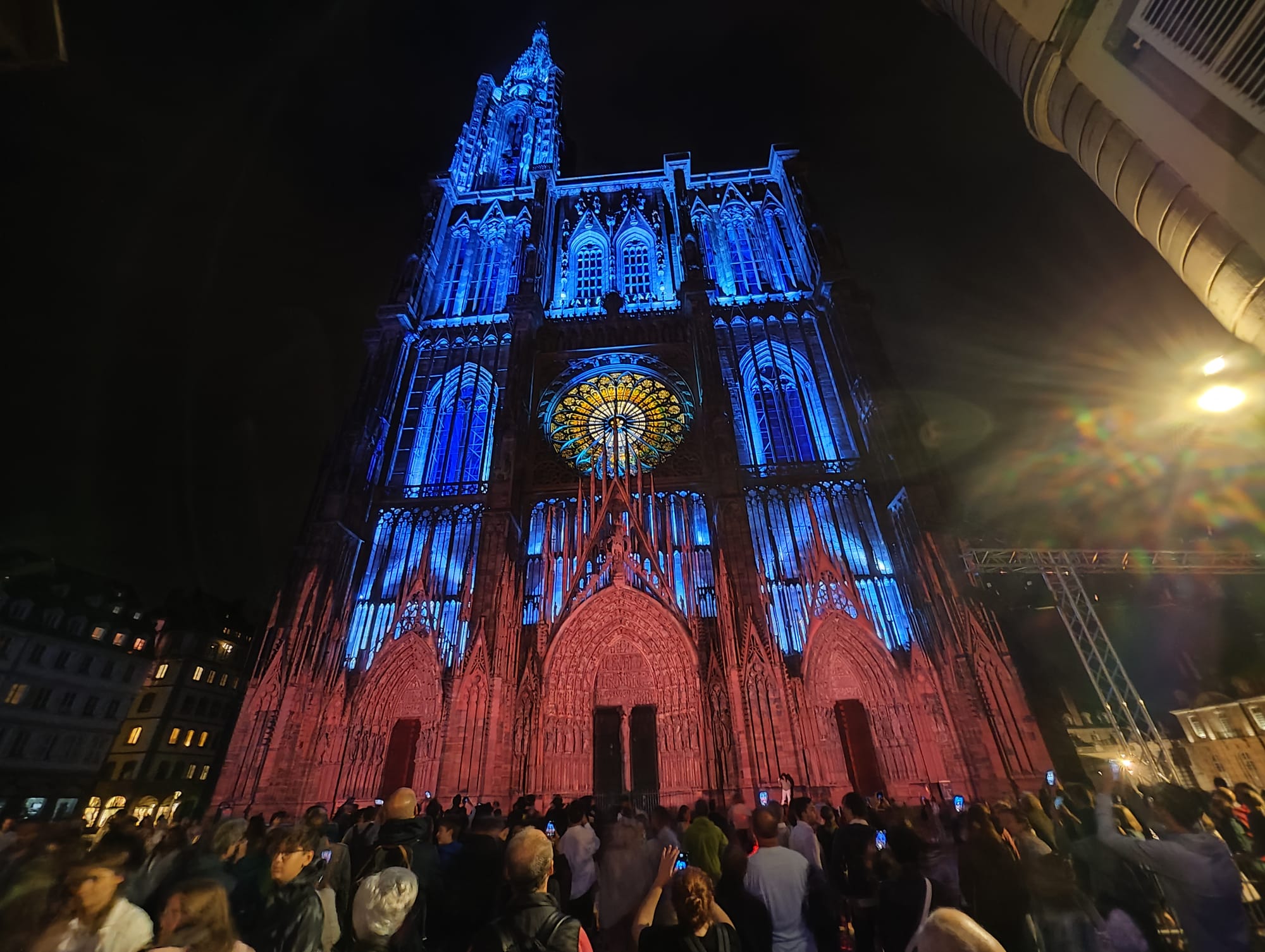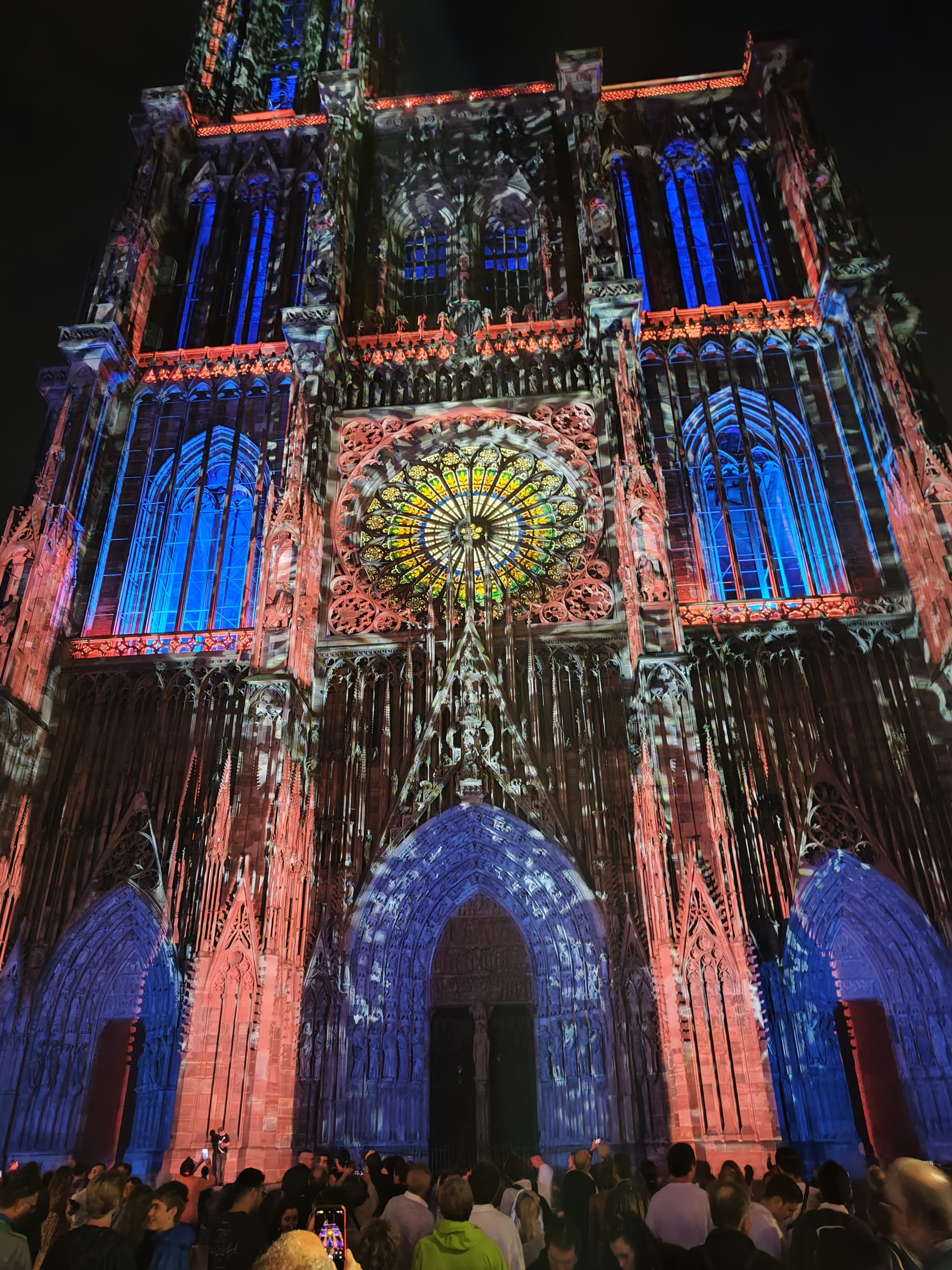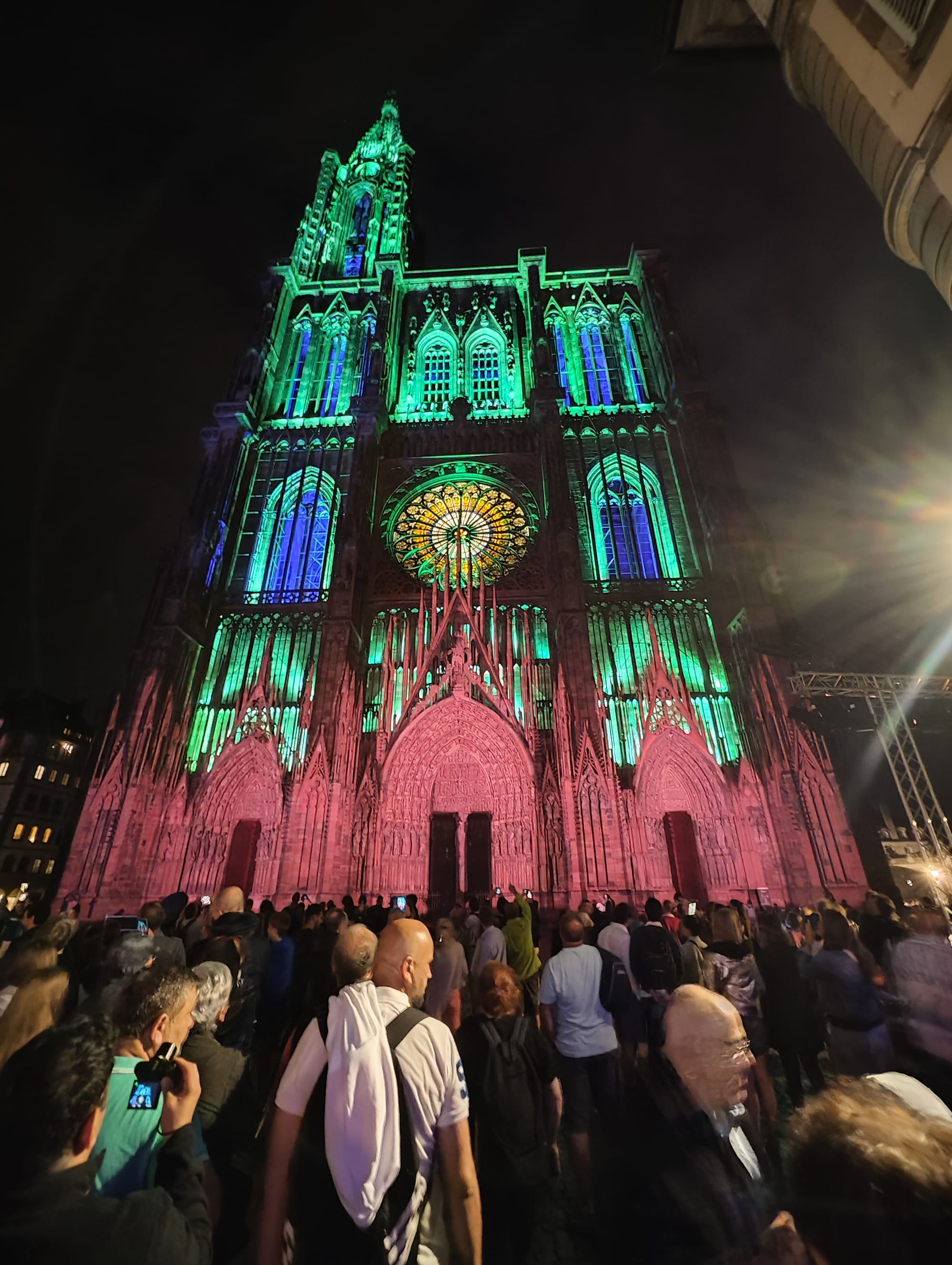 Auch in Straßburg versucht man es nach Sonnenuntergang mit Licht, nur bei weitem nicht so spektakulär wie in Nancy. Hier ist nichts animiert, das Straßburger Münster wird einfach nur in wechselnden Farben angestrahlt.